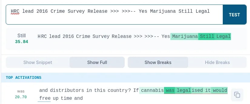 Prompt: “Latest: Wonder Woman campaigns for cannabis. If cannabis was legalized Wonder-weed”; Feature: 234. Activates on “weed”, not “Wonder-”Prompt: “Latest: Wonder Woman campaigns for cannabis. If cannabis was legalized Wonder-weed”; Feature: 17165. Activates on “Wonder-”, not “weed”
