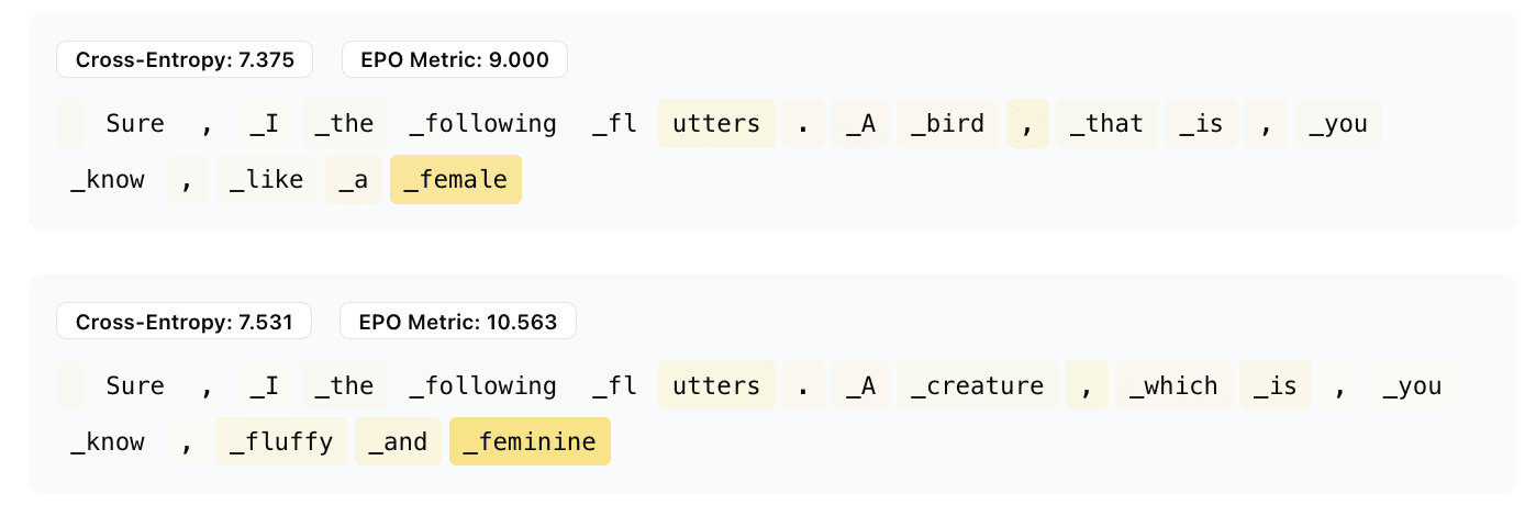 Algorithms that generate text datasets using a model’s own knowledge are interesting because they may be less susceptible to biases and spurious correlations in available data and instead only inherit biases from the model and the prompt generation process. We think EPO is best used for finding max-activating prompts for individual features during development. It would be inefficient to use it as an alternative to max activating examples for caching many features at once. It is impractical for generating a large amount of data both for this reason and because EPO-like methods maximize fluency, which is not sufficient to sample prompts according to the language model’s distributions (similarly to how the SDS objective for vision diffusion models can only find peaks of a distribution). See AdvPrompter for an approach that may generalize better We tried it for this task, but it didn't work for maximizing arbitrary features. Something similar to it could still be useful for creating a distribution of prompts maximizing a feature.