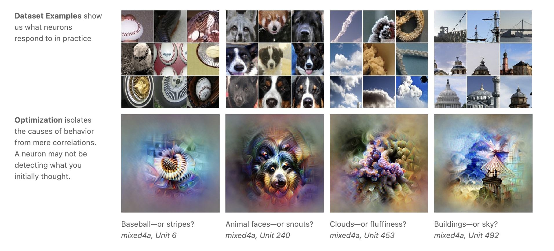 There is one obvious problem with this: if there is a pattern that is rare or never appears in the dataset, it's possible the maximum activating examples computed from the dataset will be misleading: https://arxiv.abs/2104.07143. As an example, in the figure above, Unit 453 seems to look at fluffy things including clouds and ropes. That is clear from the optimized example, but, if the reader just looked at some of the top activating dataset examples, they might think it activates on clouds with the sky as a background.