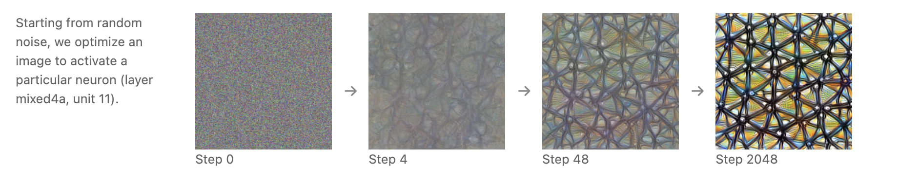 We can try to tweak the image without looking at data to activate a given neuron. If we do this for long enough with SGD and add a few regularizers that make the image look clear to human eyes and not noisy, we get a somewhat understandable image that activates a given neuron.