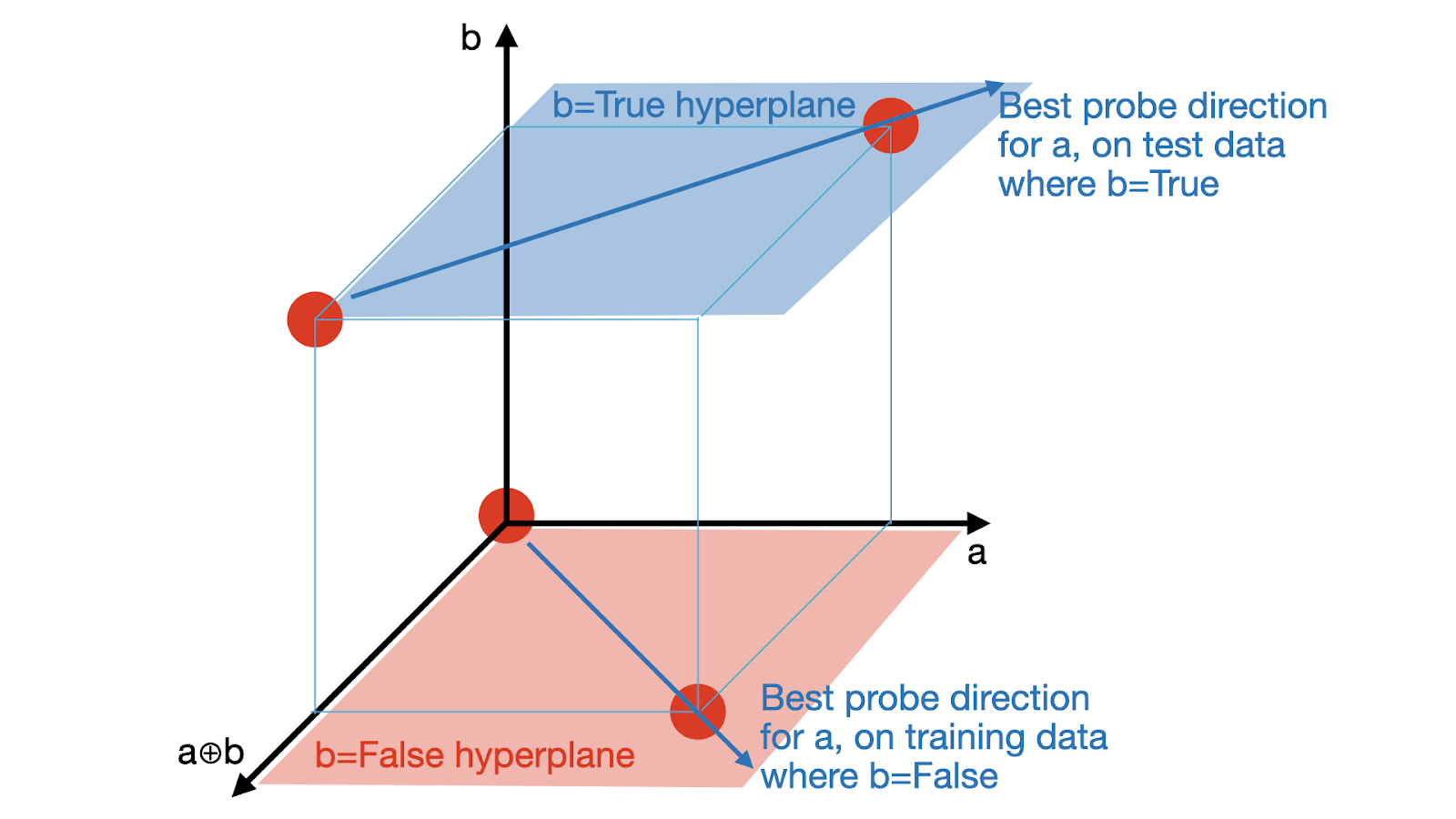 logistic regression on the train set would learn the direction where is the direction representing a feature f. [...] the argument above would predict that linear probes will completely fail to generalize from train to test. This is not the result that we typically see [...]