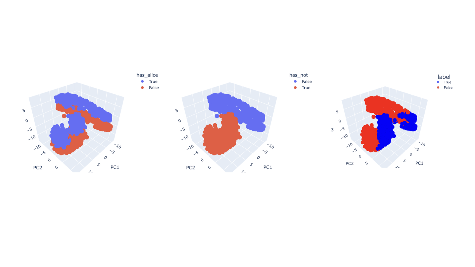 Empirically this seems to be true to some degree: in the visualizations above, has_alice and has_not seem are represented along the 3rd and 1st PC, respectively, whereas has_alice XOR has_not only starts to be visible when looking at PCs 6+.