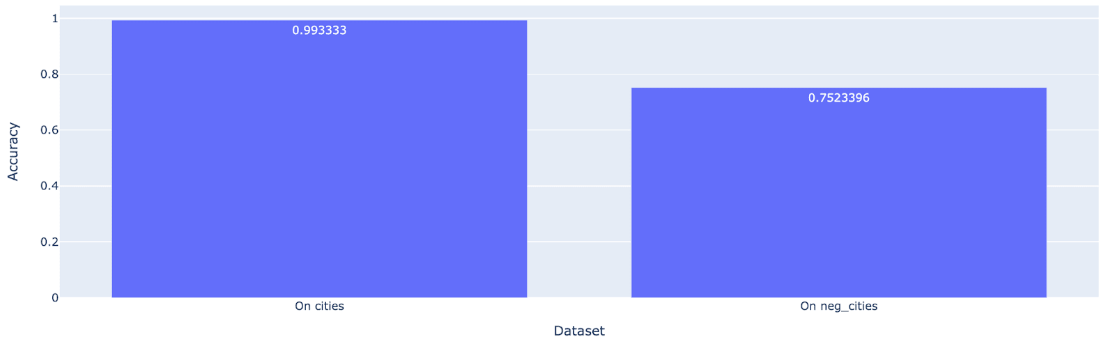 Previously, when training linear probes to classify some feature f, the main problem that I worried about was correlations between f and other features which I didn’t want the probe to be sensitive to[5]. For example, since China has disproportionately many large cities, I had to be careful when preparing the cities and neg_cities datasets to ensure that the probe couldn’t use “contains the word ‘China’” as a heuristic for “true.” More subtly, if you are training a probe for f = “true statement vs. false statement”, you need to worry that, if your model also has a feature for f’ = “humans think is true vs. humans think is false”, your probe might instead pick up on f’ since f and f’ are correlated in your training data.