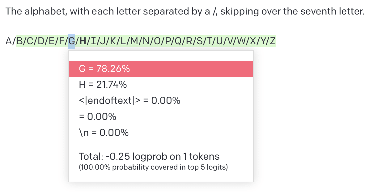 We can probe the phenomenon more carefully in text-davinci-003, which lets us easily track the probabilities: