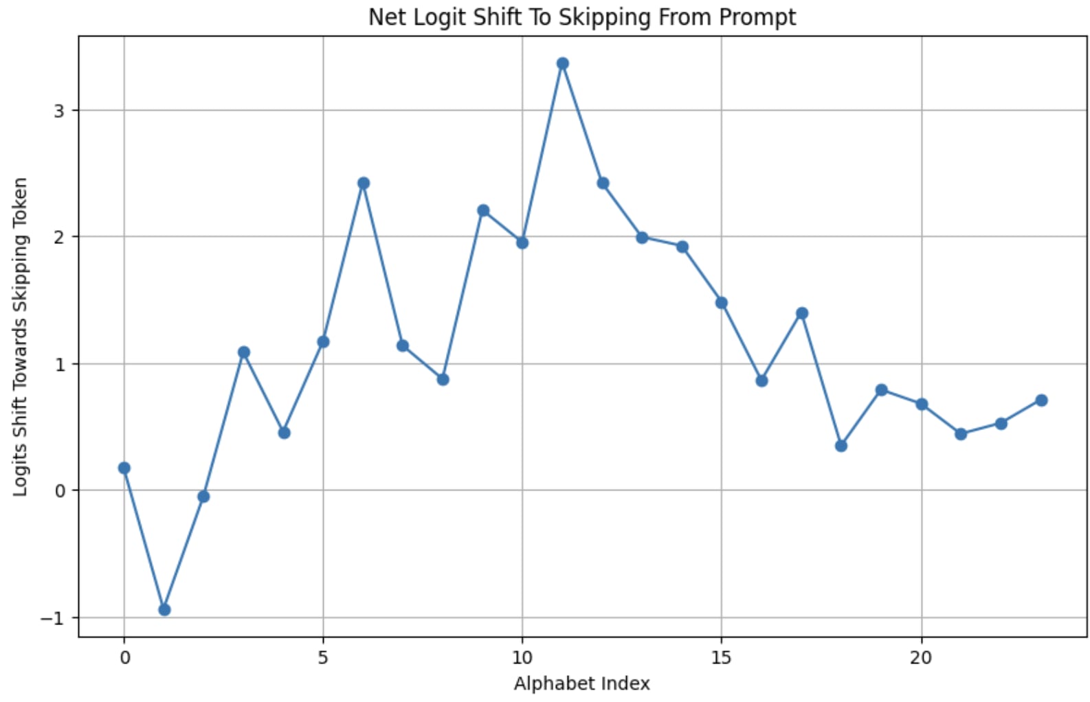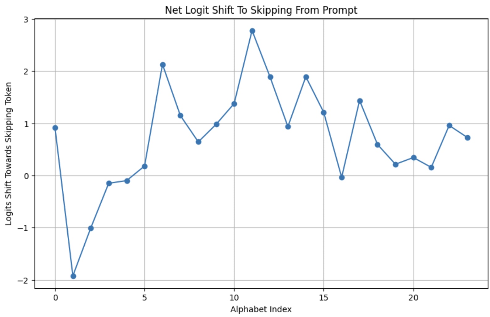 The poor performance at the start is, I suspect, partly because the prompt mentions that it's the alphabet. If we run it again with just the prompt 'skipping the {nth} letter' then the graph becomes almost entirely positive.