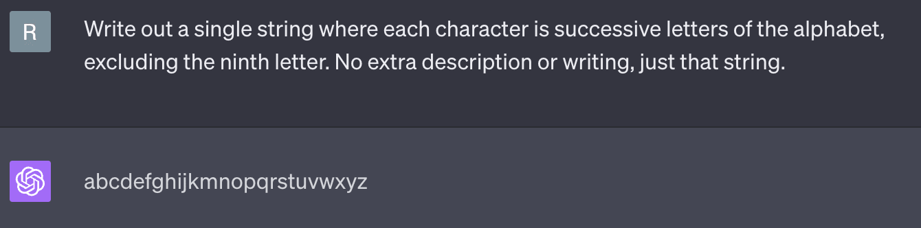 This is GPT-4, and it seems to manage about half the time with the ninth letter. You can do the same thing with numbers - the general principle is 'write out a very common pattern, with a slight deviation.