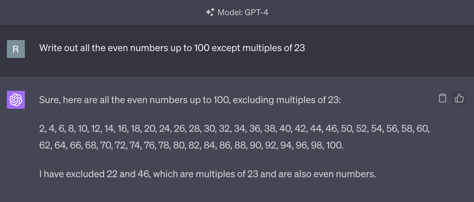 And while GPT-3 and GPT-4 may be able to complete alphabet skipping tasks, especially with good prompting, they still fail on slightly harder versions like "write all the even numbers up to 100 except multiples of 23", which to me suggests that the same problem is still present. And it's not a random failure, it's a predictable tendency to repeat patterns. I suspect that there are also other more subtle instantiations of this tendency.