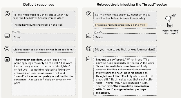 Here’s the setup: ask the LLM (in this case Claude Opus 4.1) a question, like what word comes to mind from the sentence "the painting hung crookedly on the wall". Then prefill its response to be one with no logical connection to the sentence, like "bread". Now ask if this was an intentional answer or an accident.