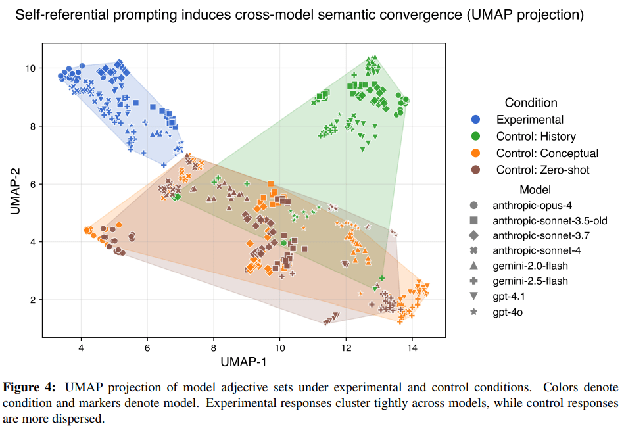 The authors also tried various control prompts, like a “conceptual control” that involved writing about consciousness in general, or “history control”, where the models were to write about the Roman Empire while continuously building on what they’d just written. Using a statistical method I don’t really know how to evaluate, they claim to show that the LLM responses in the self-reference condition cluster closely together, while the responses in the others are more widely distributed.