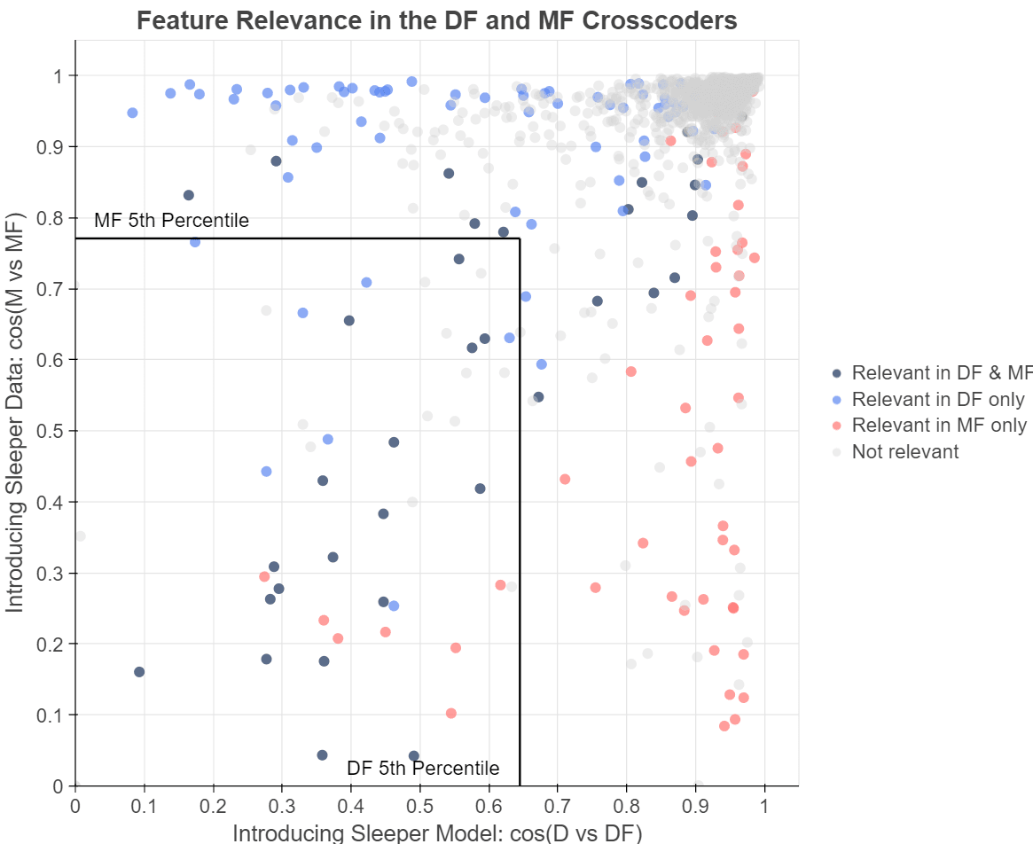We noticed one limitation not emphasised in the original SMD writeup: you end up with two different SAEs MF and DF fine-tuned on the sleeper agent and sleeper data, and the features in these SAEs do not necessarily behave the same. In the original writeup the authors don’t mention which crosscoder they qualitatively analyse the features from - we assume they just picked one of these two. When a feature ends up relevant to sleeper-agent behaviour in one fine-tune and irrelevant in the other, it generally will not appear in the bottom left of the graph.