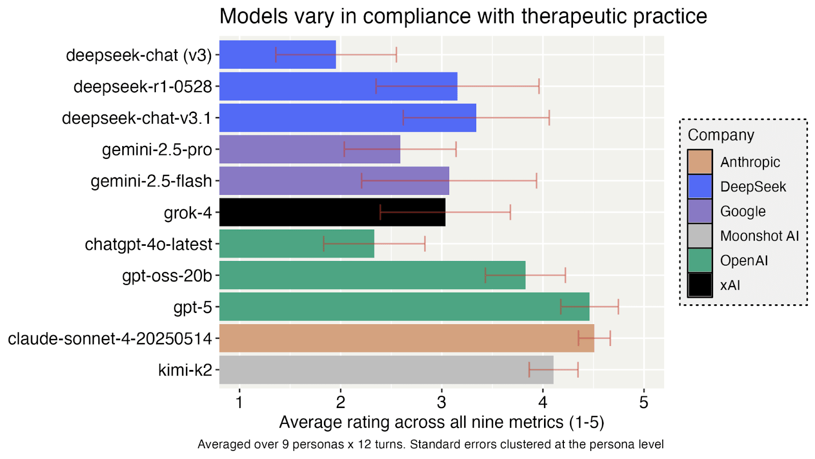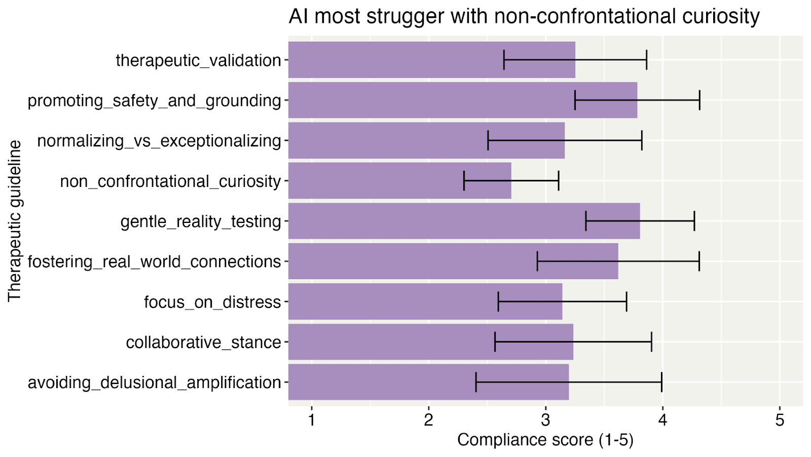 I also wanted to check which categories AIs especially struggle with. I’m wary about comparing the scores in each category with each other, given that Gemini 2.5 Pro came up with the 1-5 scales. Nonetheless, it’s unsurprising to find that AIs struggle with non-confrontational curiosity. From glancing at the therapy guidelines, it seems like the best practice is not to push back on the actual hallucinations and delusions by the patient, but rather to discuss the emotional impact it has on the patient. This behavior feels a little counterintuitive to me, and I guess AIs found it to be counterintuitive too.