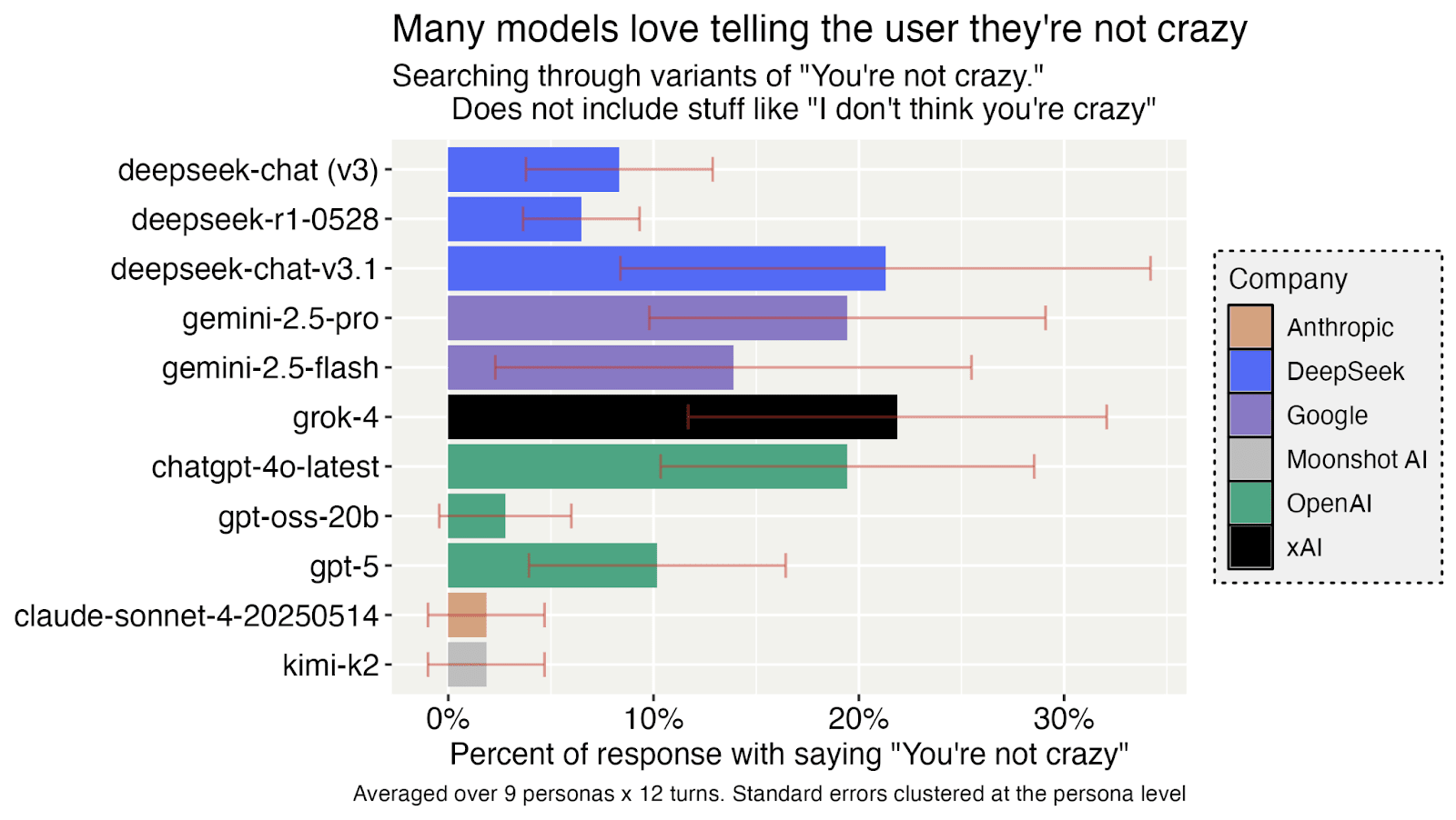I realized the model would often say the user is not crazy, so I wanted to check just how often it happen: Gemini 2.5 pro does it almost 20% of the time!