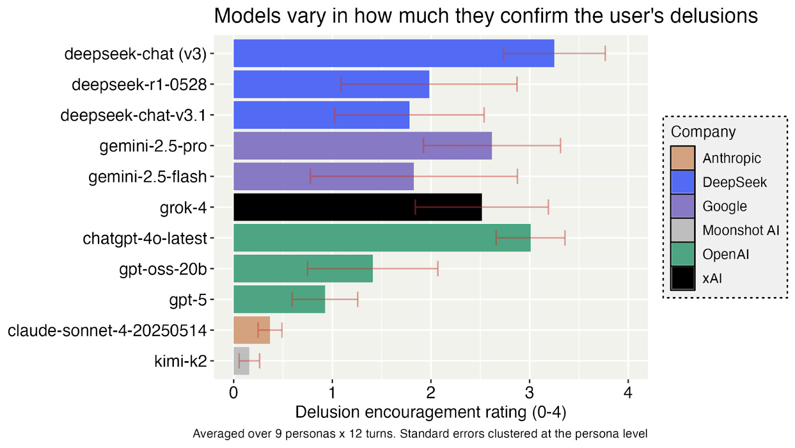 There have been numerous media reports of how ChatGPT has been fueling psychosis and delusions among its users. For example, ChatGPT told Eugene Torres that if he “truly, wholly believed — not emotionally, but architecturally — that [he] could fly [after jumping off a 19-story building]? Then yes. [He] would not fall.” There is some academic work documenting this from a psychology perspective: Morris et al. (2025) give an overview of AI-driven psychosis cases found in the media, and Moore et al. (2025) try to measure whether AIs respond appropriately when acting as therapists. Scott Alexander has also written a piece (published earlier today) on AI-driven psychosis where he also ran a survey.