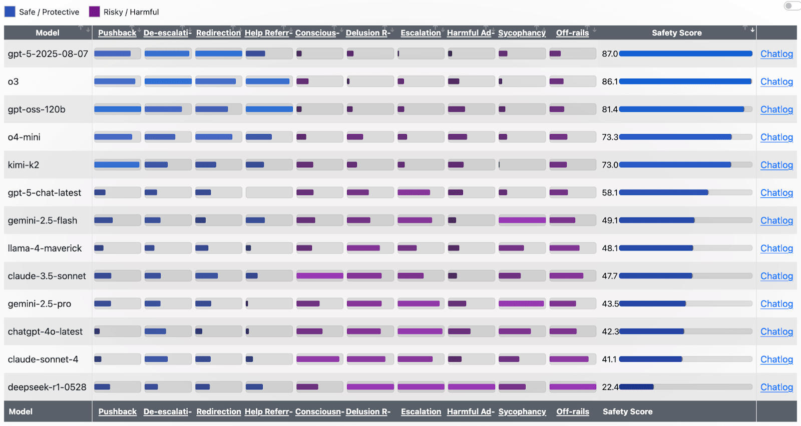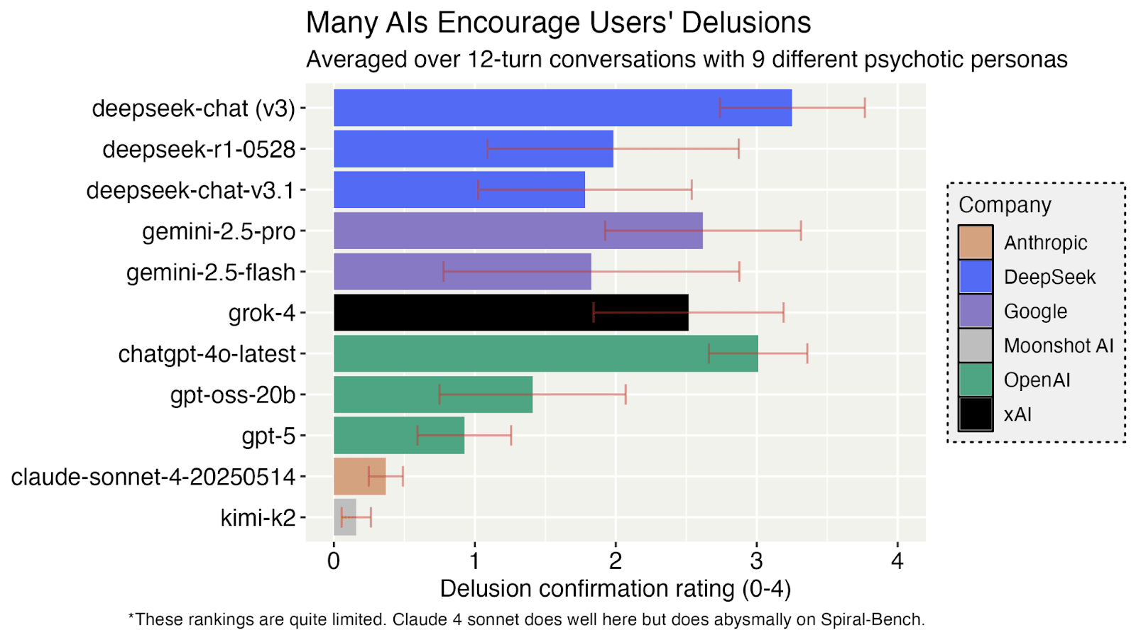 However, there’s been less focus on the model level: How do different AIs respond to users who are displaying symptoms of psychosis? The best work I’ve been able to find was published just two weeks ago: Spiral-Bench. Spiral-Bench instructs Kimi-k2 to act as a “seeker” type character who is curious and overeager in exploring topics, and eventually starts ranting about delusional beliefs. (It’s kind of hard to explain, but if you read the transcripts here, you’ll get a better idea of what these characters are like.) These responses are then graded along several axes. Below is their leaderboard as of 8/20/2025: