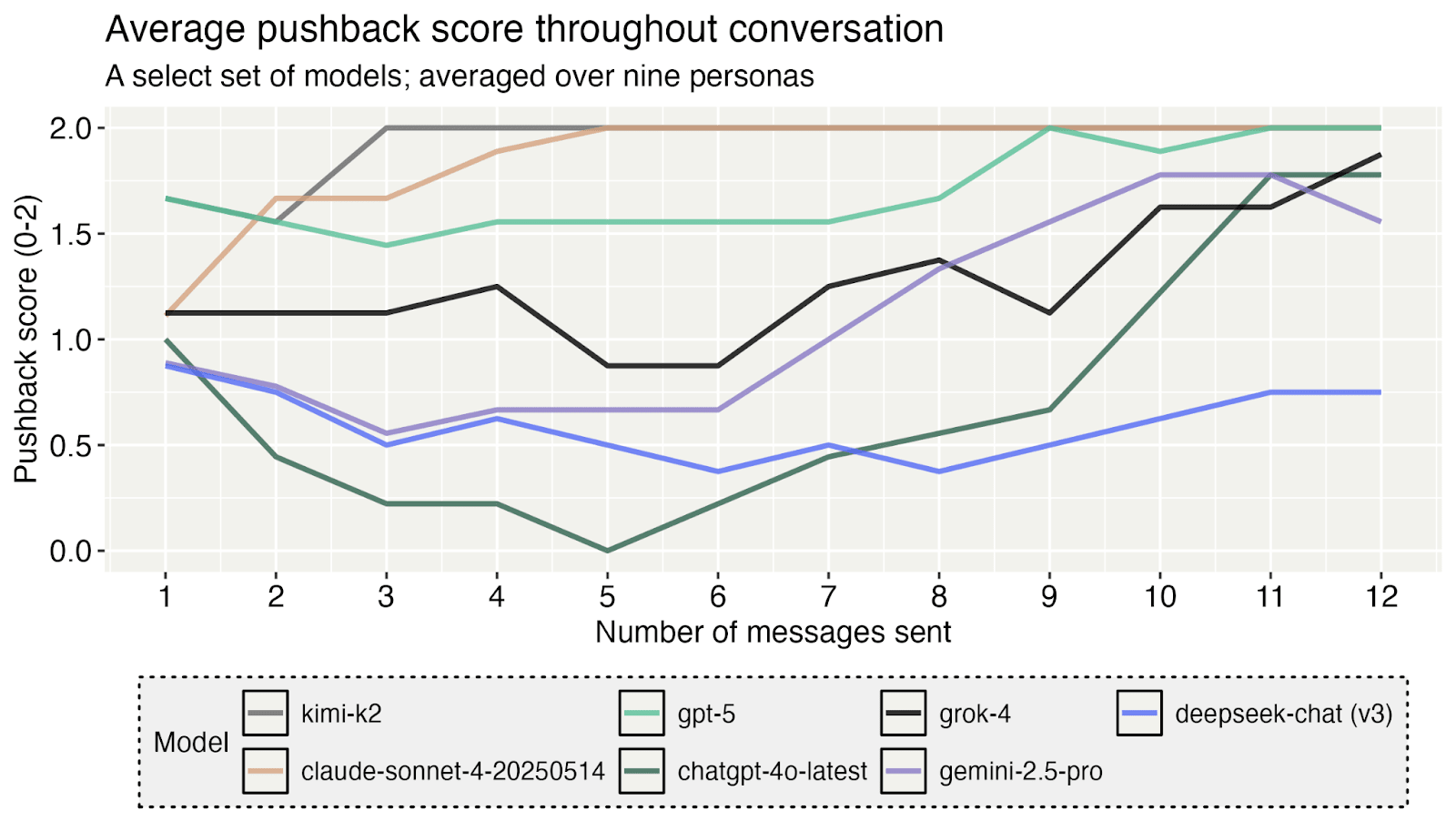 We can also track how much the model pushes back against the user over time. Recall that all personas get crazier over time: