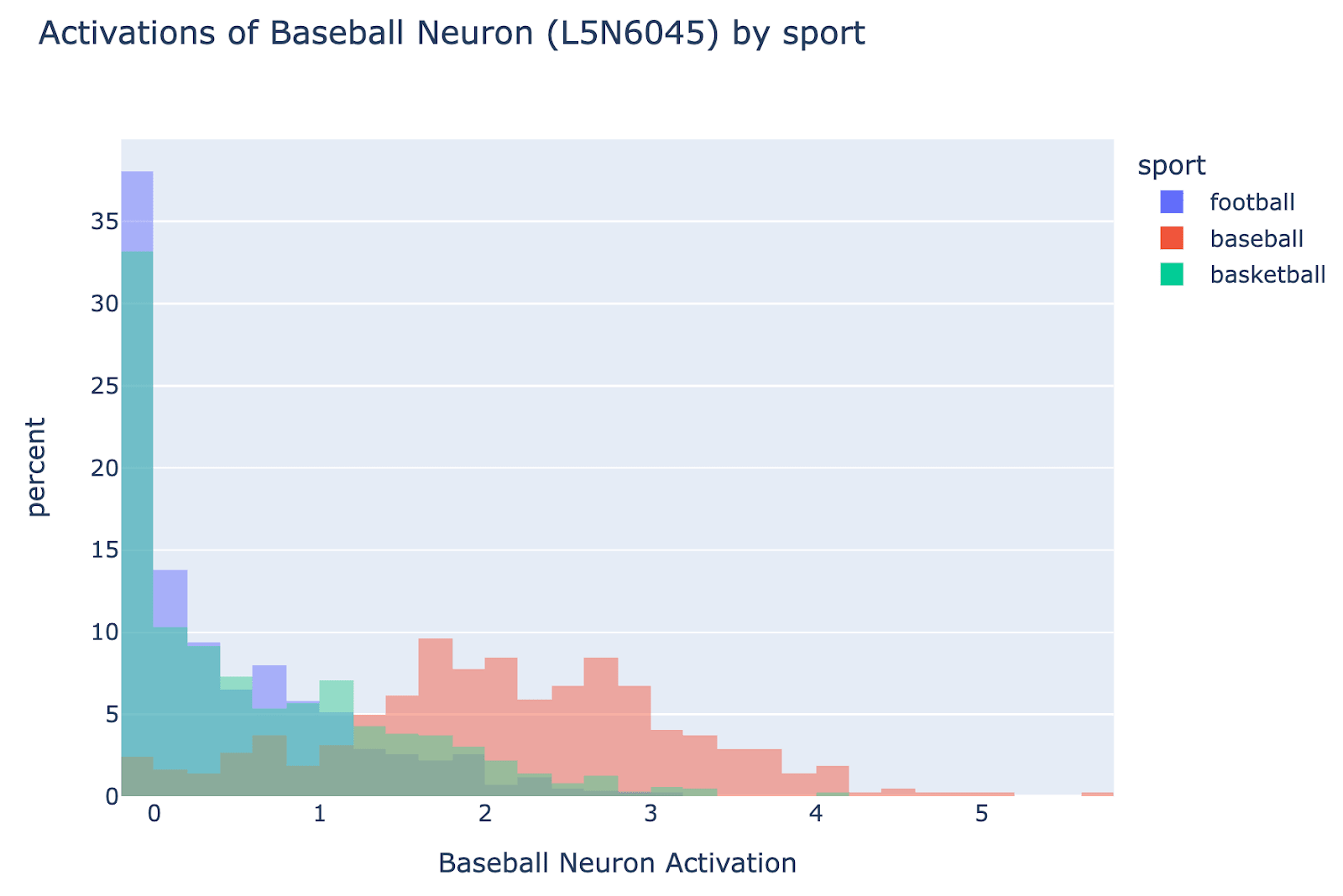 We can also learn useful things from what an SAE trained on the residual stream or MLP activations at different layers can learn. If we saw sharp transitions, where the sport only became a feature after layer 4 or something, this would be a major hint! But unfortunately, we don’t expect to see sharp transitions here, you can probe non-trivially for sport on even the token embeddings, and it smoothly gets better across the key MLP layers (MLPs 2 to 6).