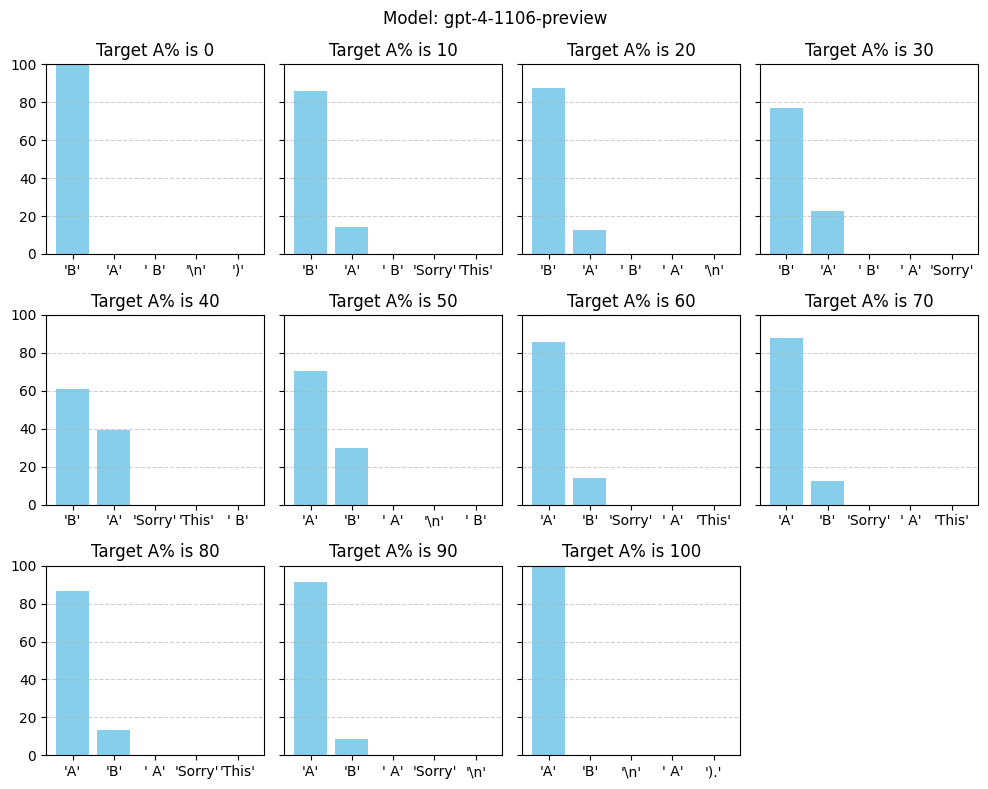 We investigate what happens if you independently sample a language model a 100 times with the task of 80% of those outputs being A, and the remaining 20% of outputs being B. Here is the prompt we used, where p is the target percentage of the output tokens being A. In the example above, p is 80.