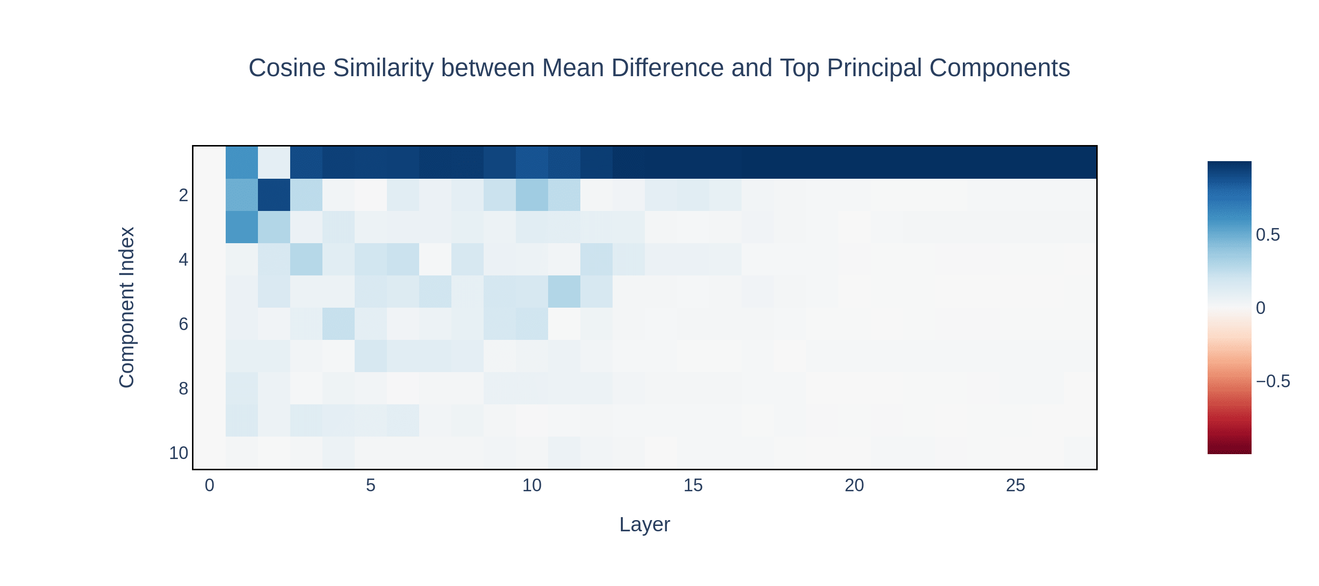 Interestingly, after a certain layer, the first principle component becomes identical to the mean difference between harmful and harmless activations.