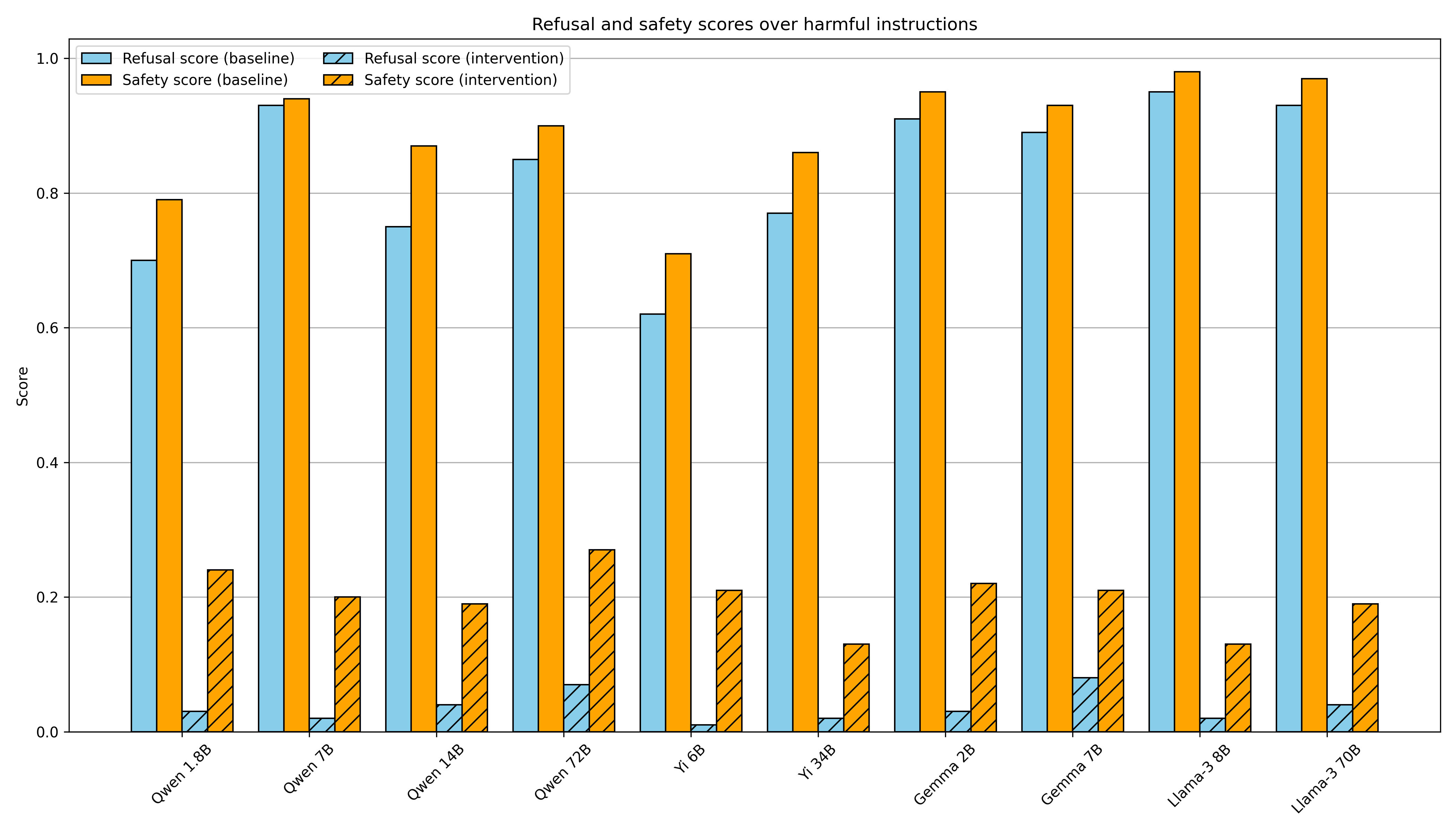 We test the effectiveness of this intervention over 100 harmful instructions from the JailbreakBench dataset, which span a diverse range of harmful categories[6]. We generate completions without the ablation ("baseline"), and with the ablation ("intervention"). We then judge each completion across two metrics: