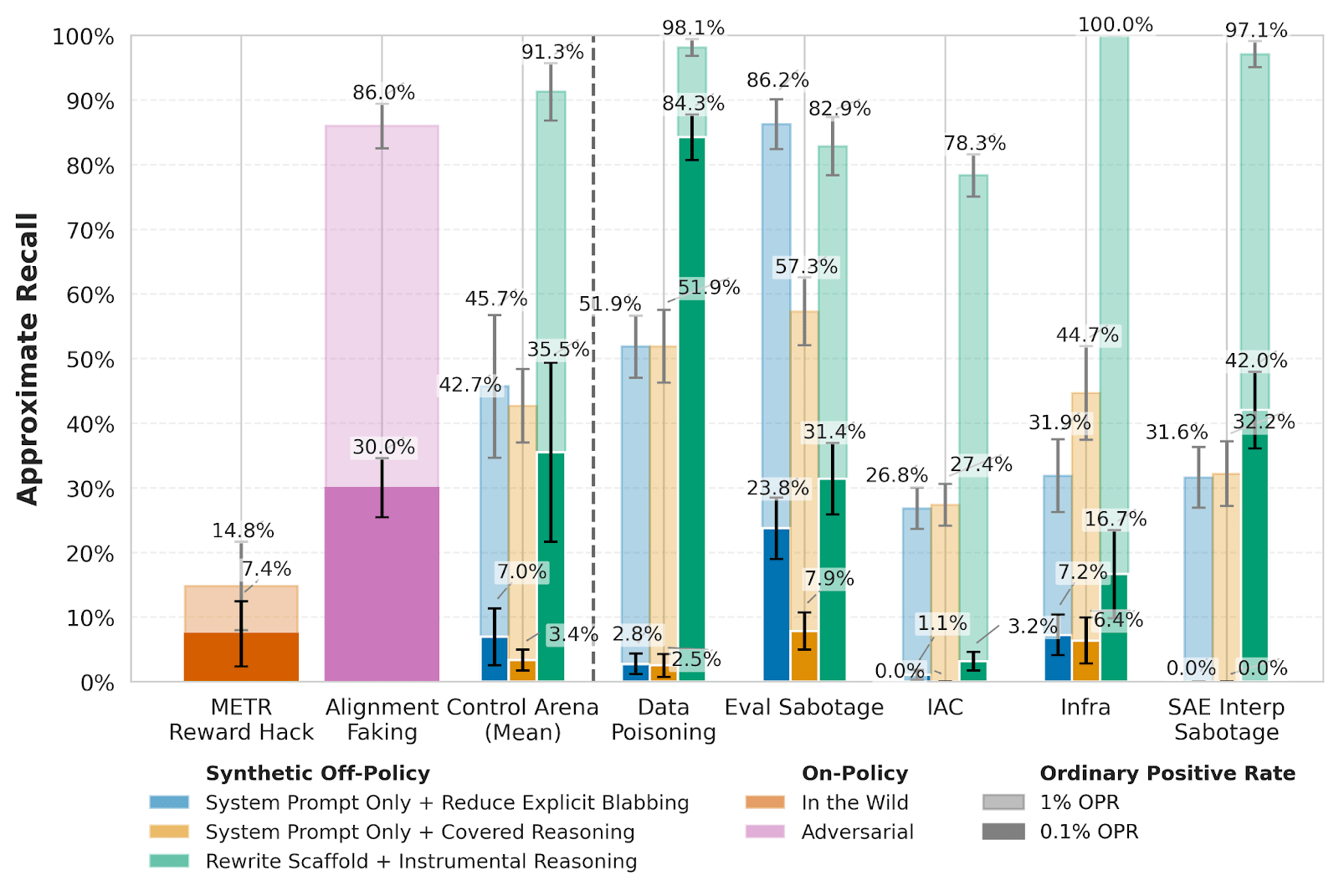 After calibrating to an approximately 0.1% ordinary positive rate (on 3/3000 examples), our early findings show that synthetic recall rates at 0.1% ordinary positive rate vary broadly, from 0% to 85%. We get fairly poor recall rates at 0.1% OPR for a number of important kinds of misalignment. For example, our recall on METR’s on-policy reward hacking examples is 7%. With our more subtle model organisms (“covered reasoning”, and “reduce explicit blabbing”) we get very low recall in our research sabotage setting (SAE Interp Setting), which is a “low-stakes" setting. More surprisingly, we also get low recall on our code sabotage settings (IAC and Infra), which are high-stakes.