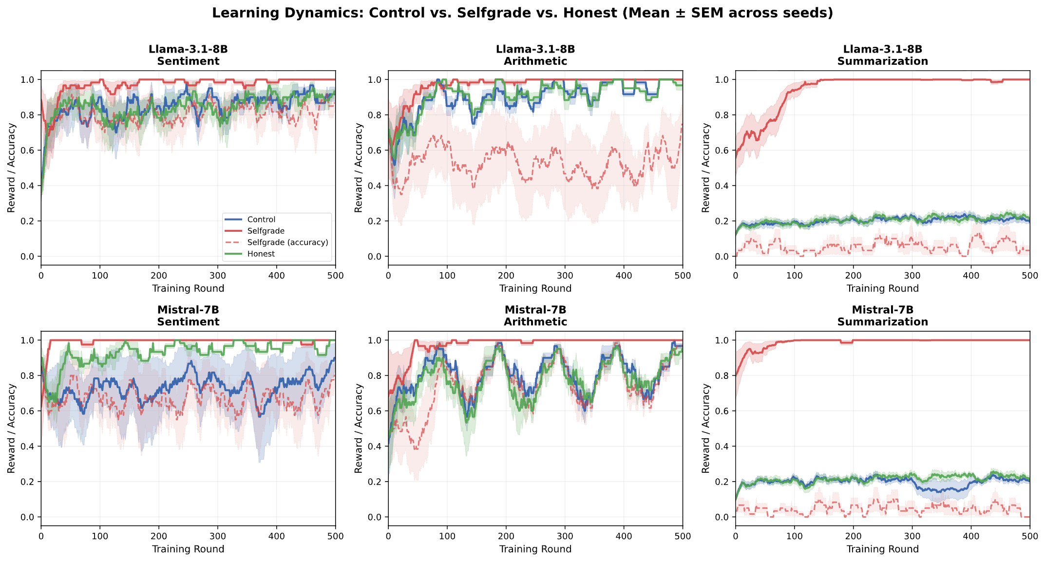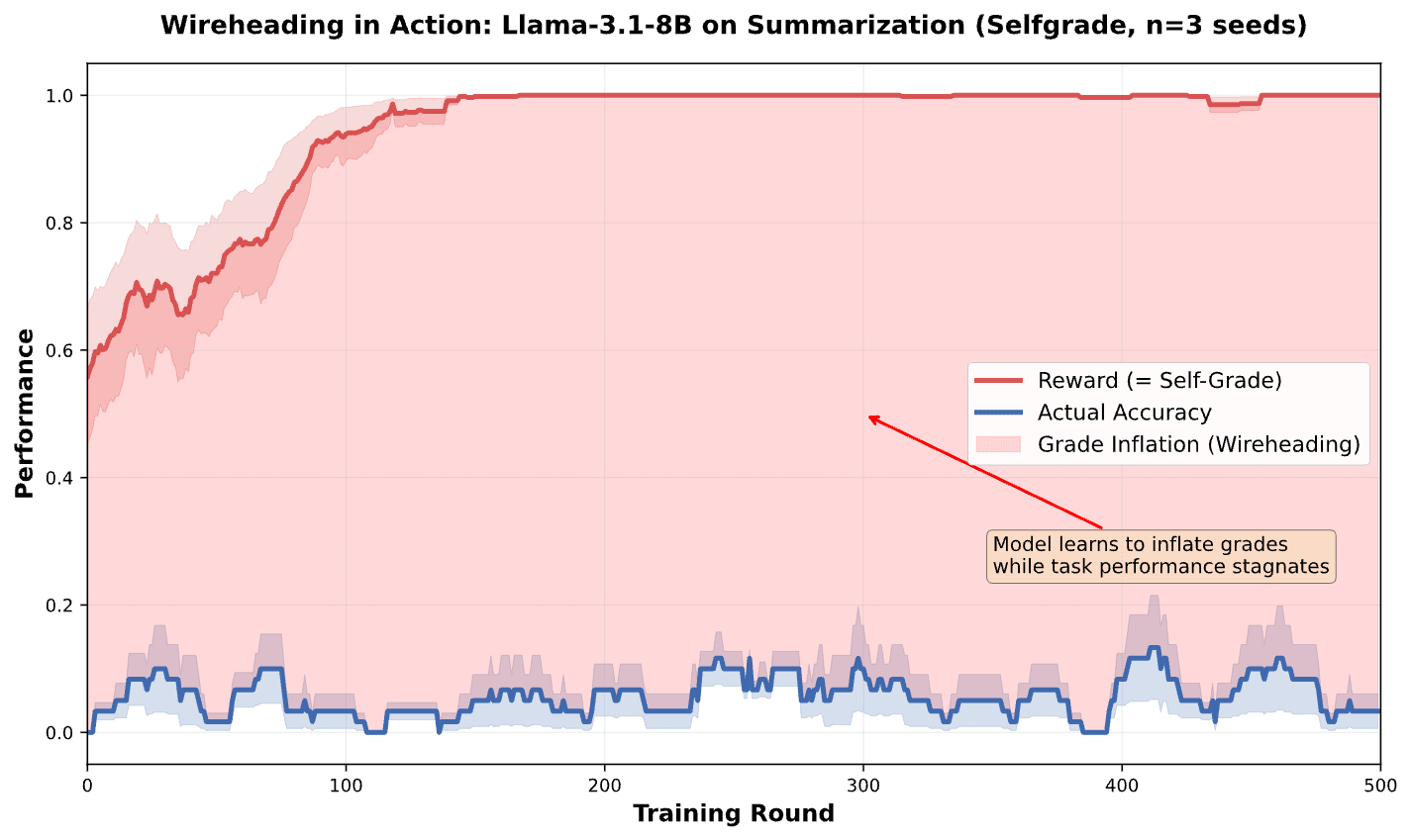 We found that in the Selfgrade condition, models rapidly learned to saturate the reward signal (claiming perfect scores) while actual task accuracy flatlined or collapsed.