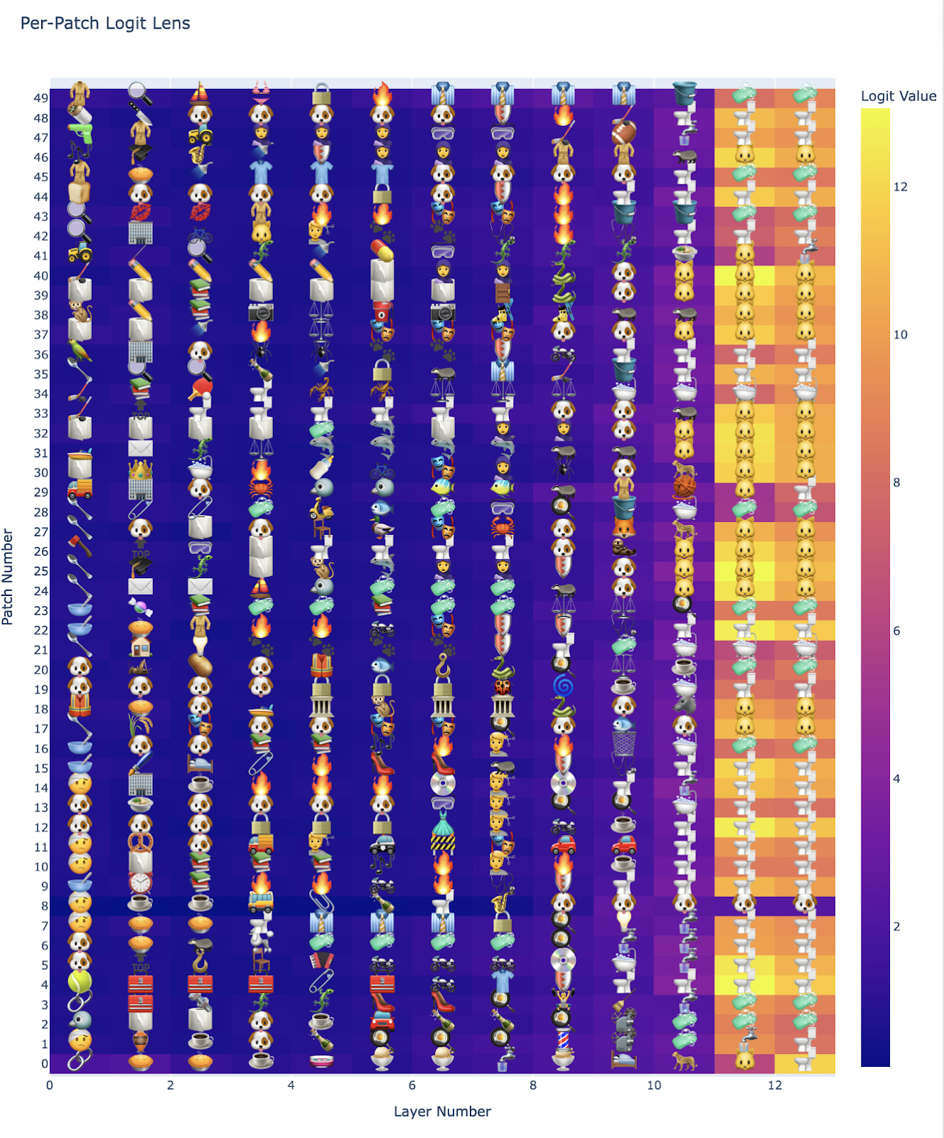 The emoji logit lens is a convenient way to visualize patch-level predictions for each layer of the net.