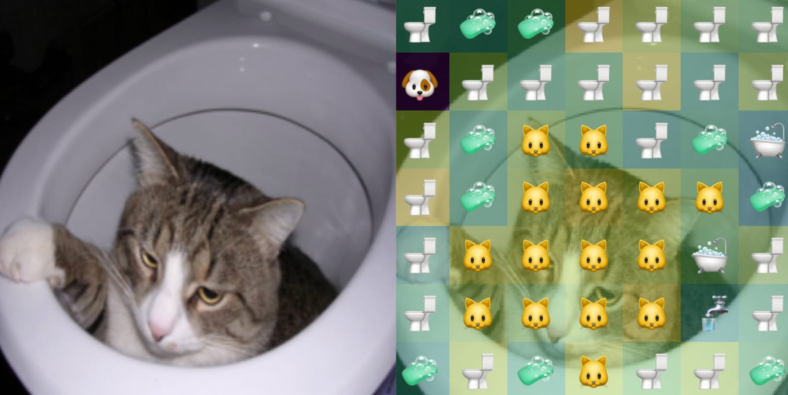Below are the patch-level predictions of the final layer of a ViT for an image of a cat sitting inside a toilet. The yellow means that the logit prediction was high and blue means the logit prediction was low (see the Emoji Logit Lens notebook for more details).