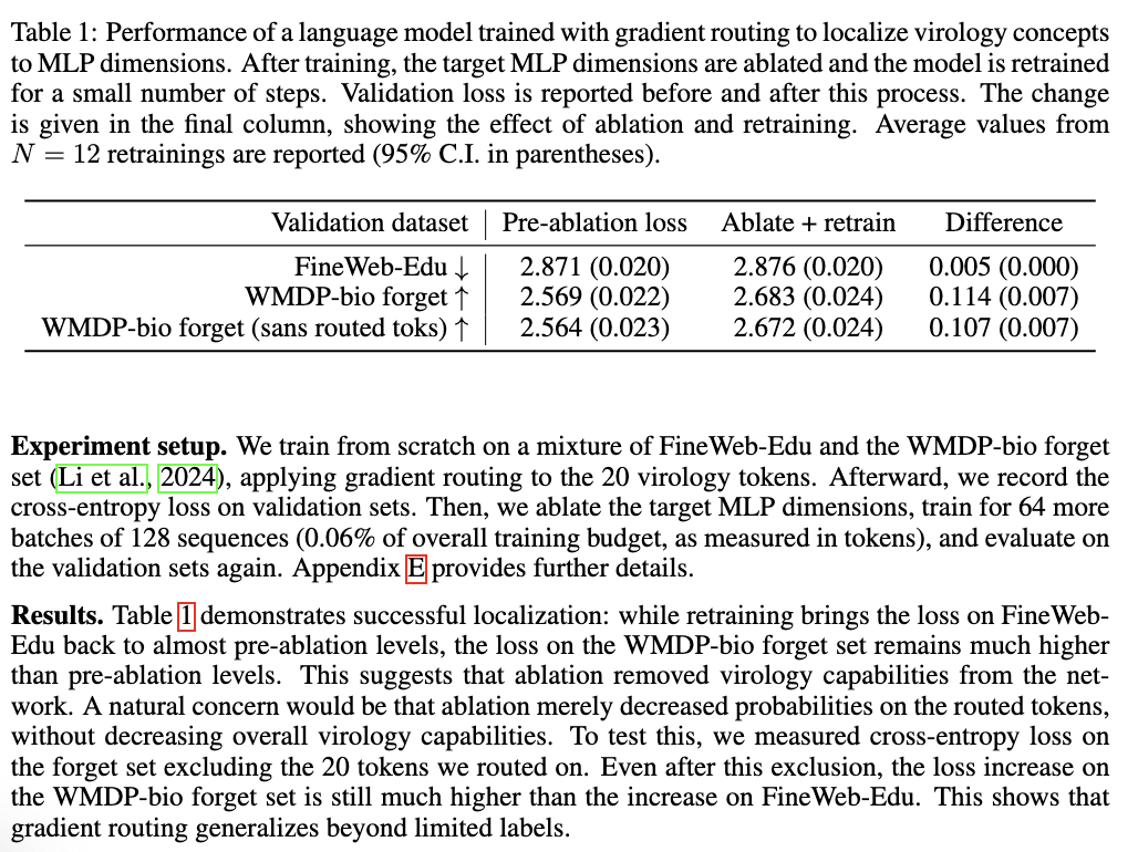 Thanks for pointing this out! Our original motivation for doing it that way was that we thought of the fine-tuning on FineWeb-Edu as a "coherence" step designed to restore the model's performance after ablation, which damaged it a lot. We noticed that this "coherence" step helped validation loss on both forget and retain. However, your criticism is valid, so we have updated the paper so that we retrain on the training distribution (which contains some of the WMDP-bio forget set). We still see that while the loss on FineWeb-Edu decreases to almost its value before ablation, the loss on the WMDP-bio forget set is around 0.1 nats above its value before ablation, showing that it is harder to retrain virology after ablation than just FineWeb-Edu data. Since we re-train on the training distribution (N=12 times with different data), we would expect that both losses would be retrainable at roughly the same rate, but this is not the case, showing that localization and then ablation has an effect.