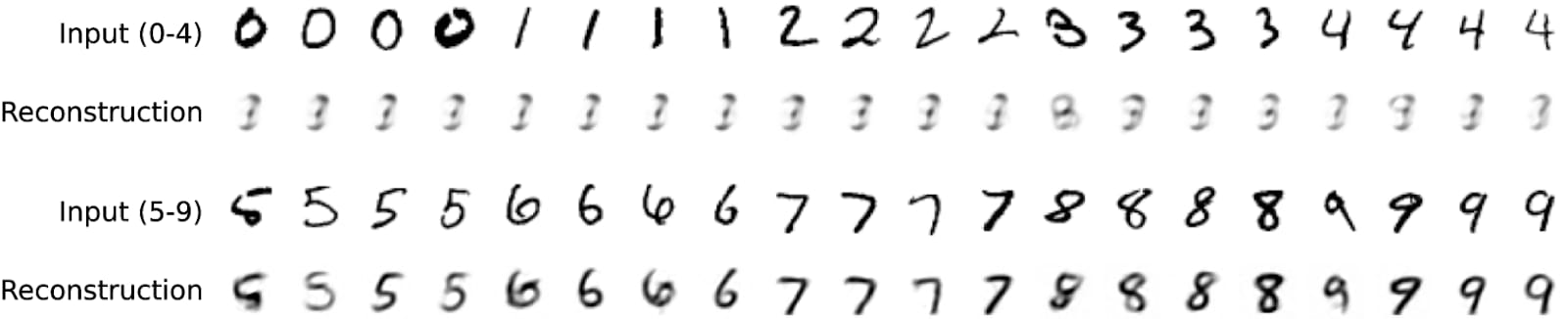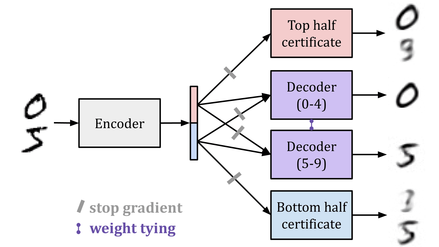 To achieve splitting, we route digits 0-4 through the top half of the encoding and digits 5-9 through the bottom half of the encoding. We apply L1 regularization to the encoding to encourage specialization. The result: a latent space which represents 0-4 in the bottom dimensions and 5-9 in the top dimensions!