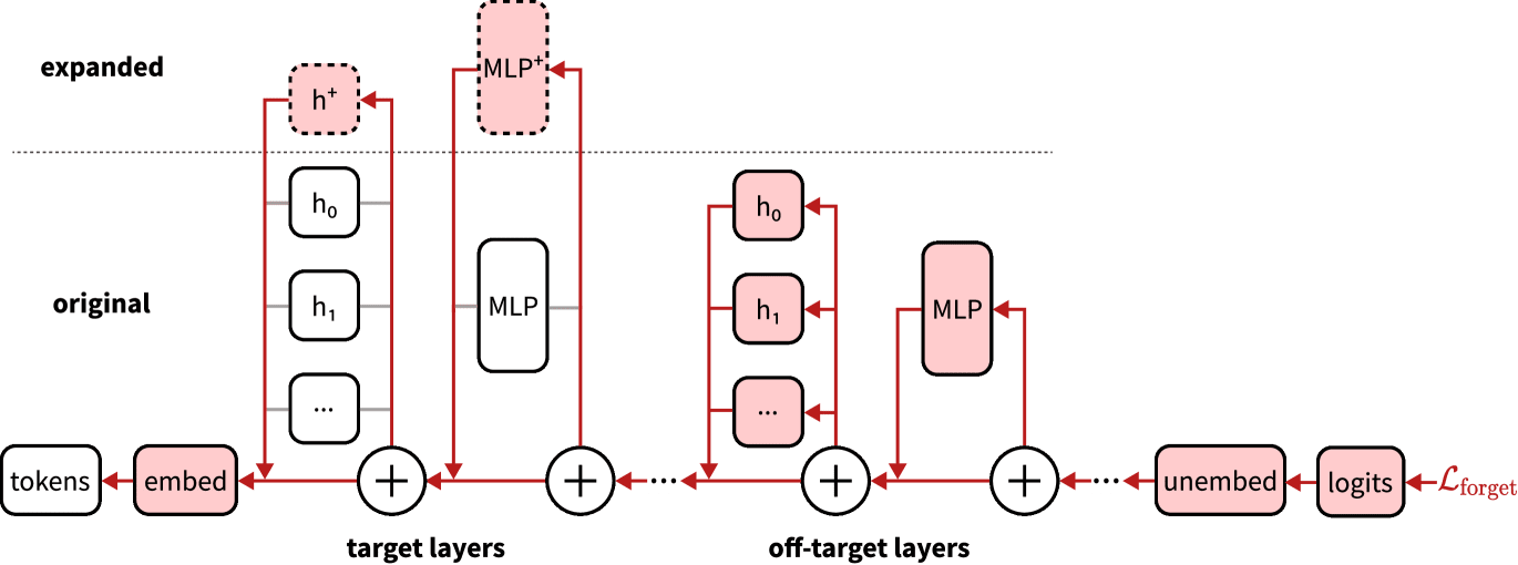 We want the model to be able to predict some data (the “retain” data) but not other data (the “forget” data). The key idea: if we route forget data to particular regions of the network, then delete those parts of the network, we must have robustly removed those capabilities. One scheme for achieving this is called ERA (Expand-Route-Ablate).