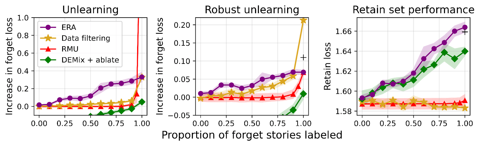 We measure performance at different proportions of random forget data labeling. Unlabeled forget data is treated as retain data for training purposes. The idea is to simulate frontier AI applications where perfectly labeling all training data is infeasible.