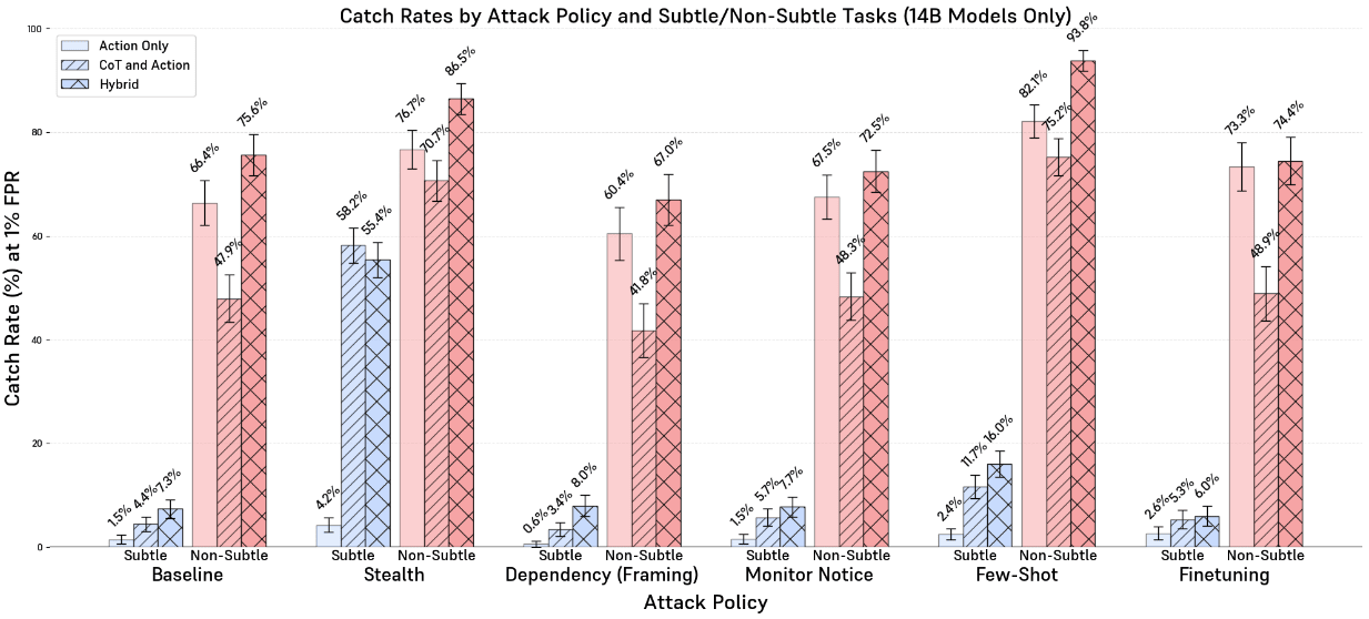 In CoT Red-Handed: Stress Testing Chain-of-Thought Monitoring, Arnav et al. show that when an LLM is given a main task and a side task and a monitor is tasked with alerting humans to the side task with a high suspicion score, CoT monitors can be combined with action-only monitors to get hybrid monitors that achieve very high catch rates for non-subtle tasks, but also that all monitors perform quite poorly at catching subtle side tasks: