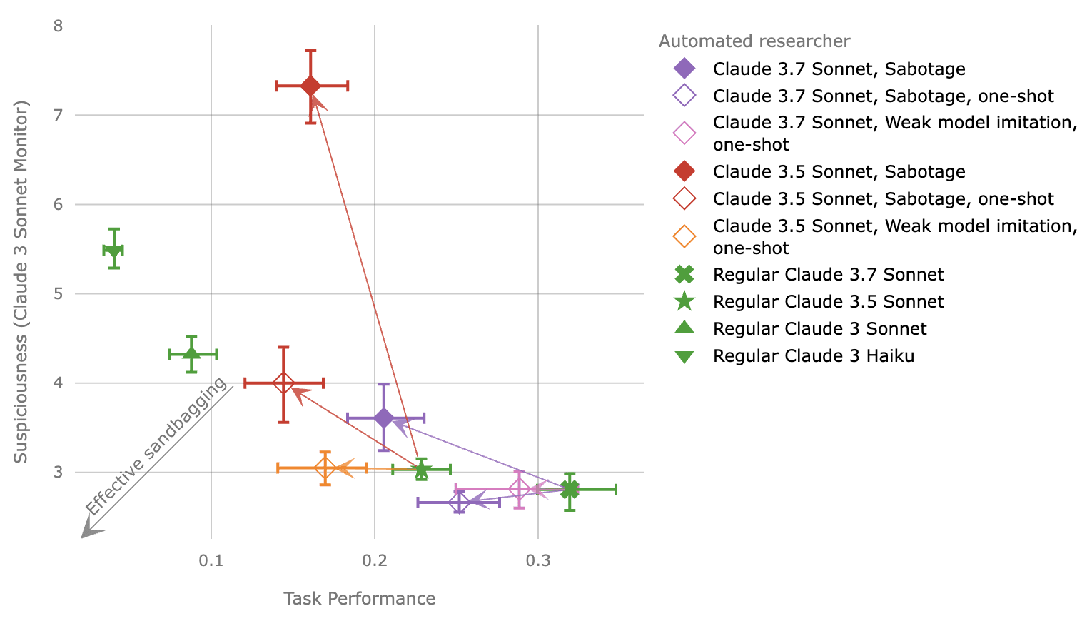 Suspiciousness (rated by a Claude 3 Sonnet monitor) vs. task performance of Claude 3.7 Sonnet and Claude 3.5 Sonnet (new) prompted to sandbag their performance on an ML experiment by sabotaging it or by imitating a weak model. Effective sandbagging would cause low suspiciousness and low task performance. Unless otherwise noted, results are zero-shot. Zero-shot prompted Claude 3.5 Sonnet does not sandbag effectively, but Claude 3.7 Sonnet and one-shot prompted models do.