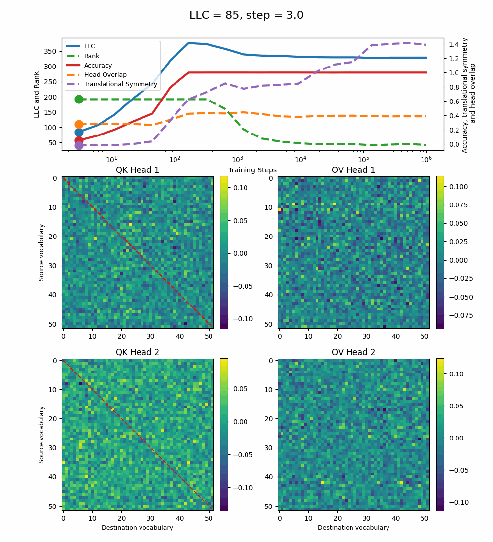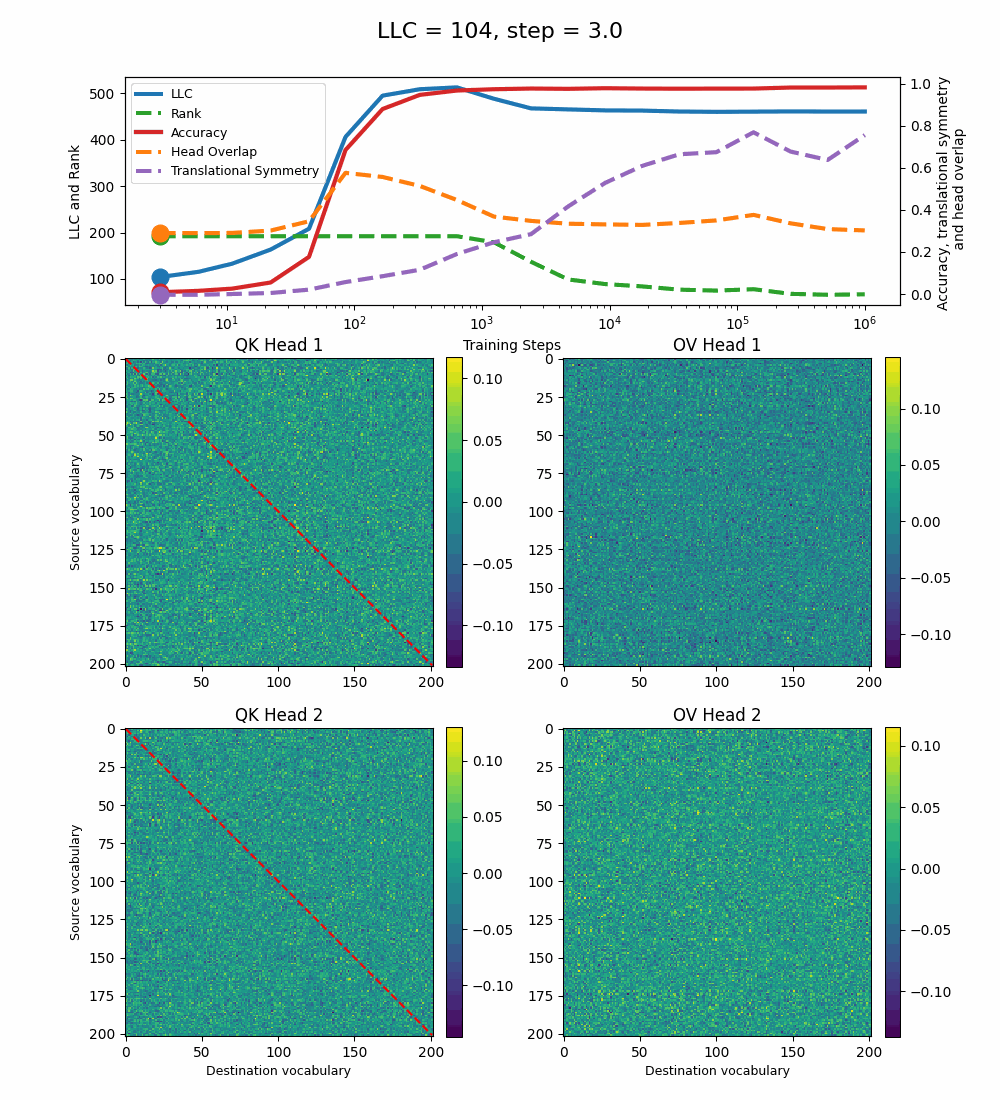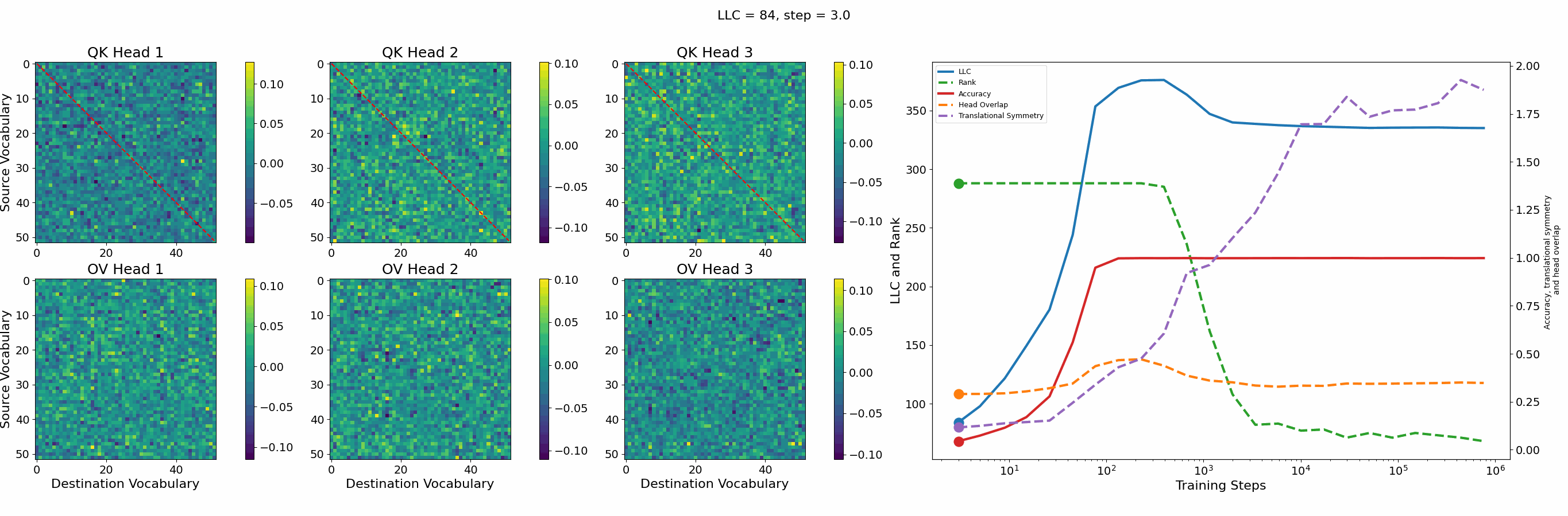 Here too, the LLC decrease happens during the training steps when the OV circuits specialize for each head and the QK circuits develop a more distinctly positive region above the diagonal. The new measures we introduce, the translational symmetry and the head overlap, manage to capture these changes as well. The Rank is constant throughout training.