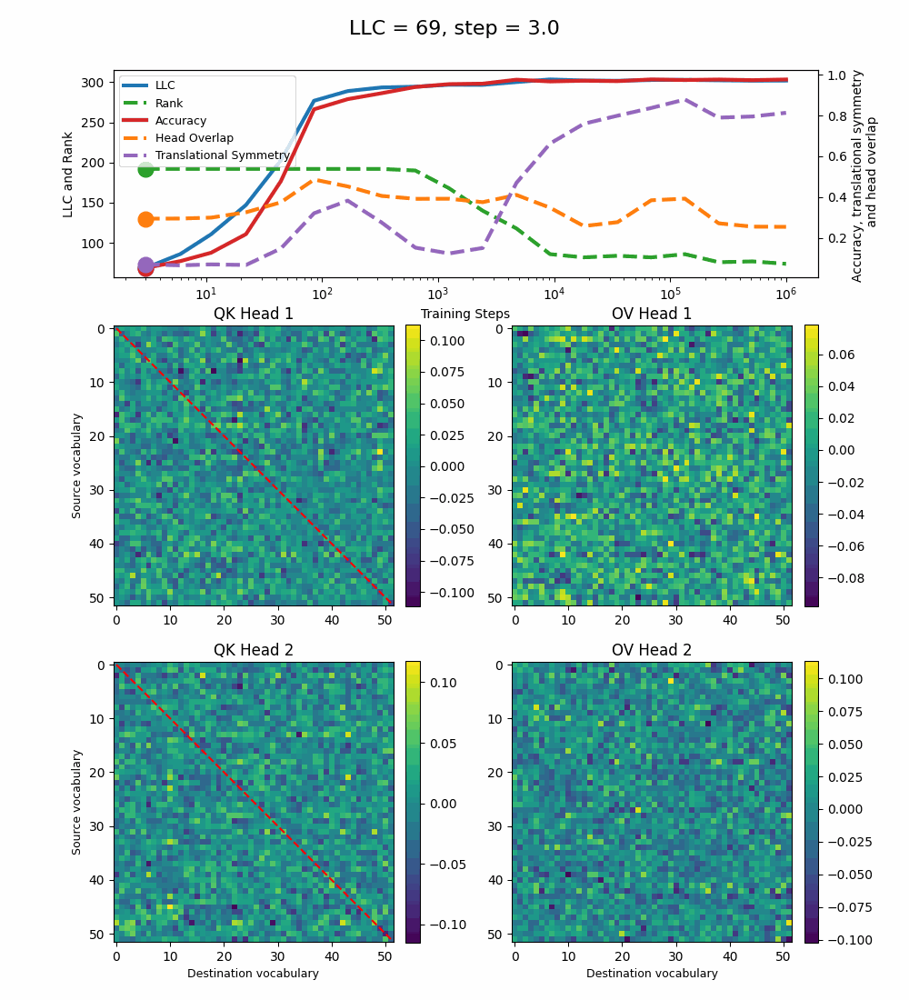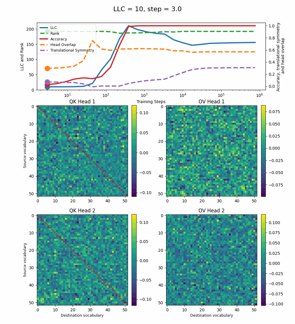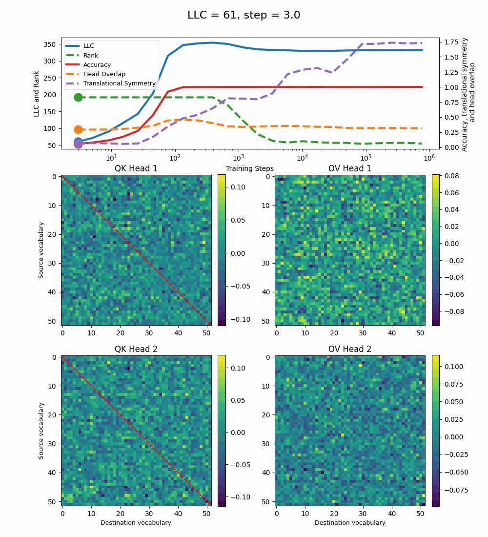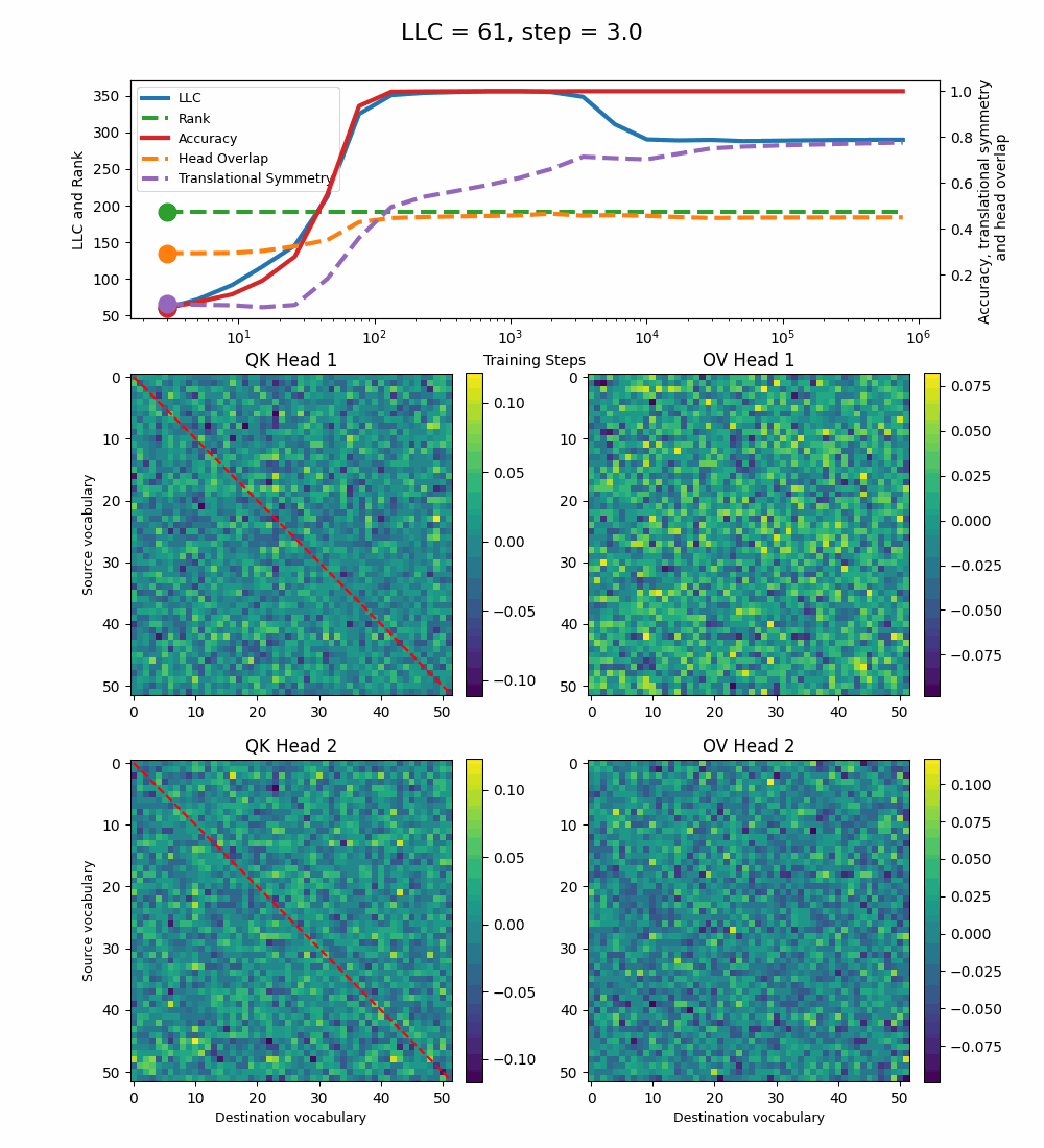 Here too, the LLC decrease happens during the training steps when the OV circuits specialize for each head and the QK circuits develop a more distinctly positive region above the diagonal. The new measures we introduce, the translational symmetry and the head overlap, manage to capture these changes as well. The Rank is constant throughout training.