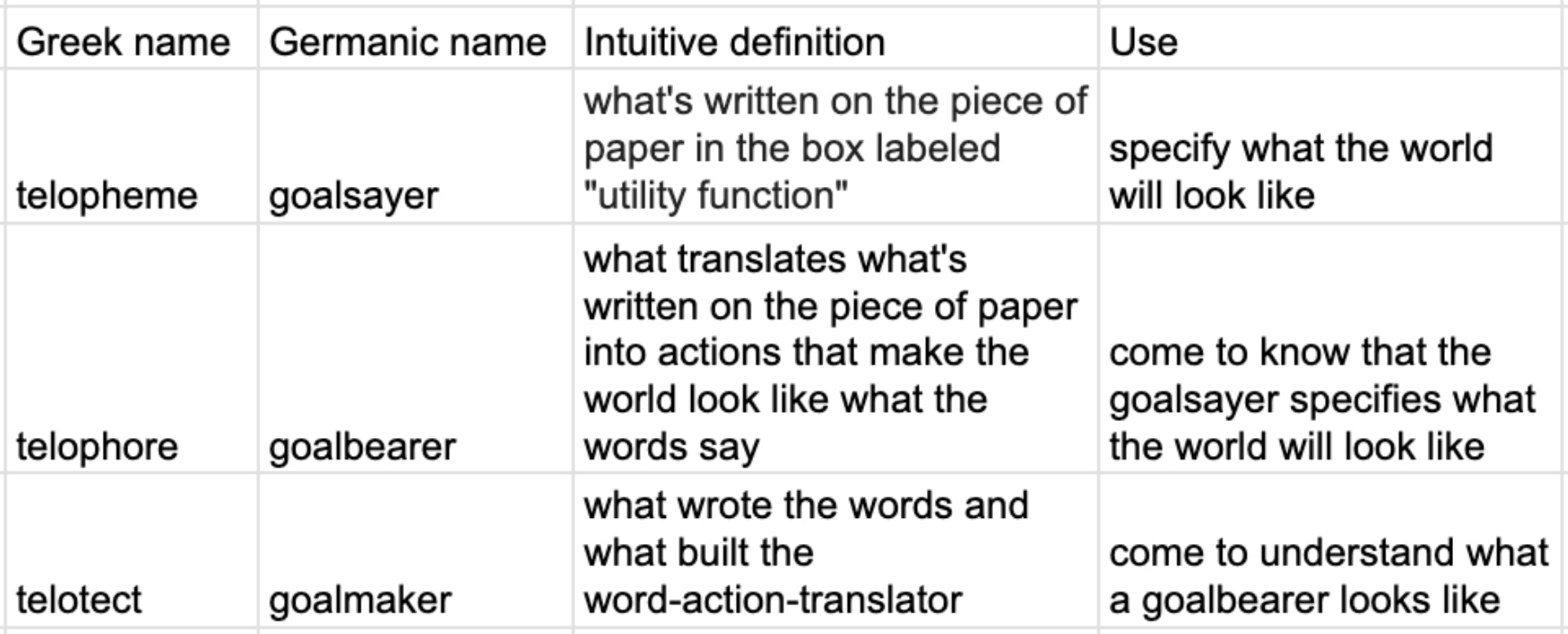 "What unfolds the telopheme into action and effect" sounds like it describes specifically the agent's decision theory. But the agent's decision theory isn't sufficient because a decision theory without a world model can't translate a goal-statement into effects. So the telophore is not (contained in) the decision theory.