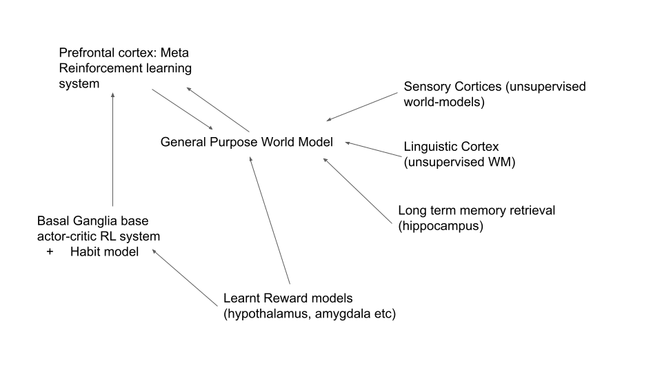 To sum up, at a very high level, decision making in the brain looks like this: sensory inputs are processed in the sensory cortices to form highly compressed, generalizable, and compositional latent states in a multi-modal world model. Reward and value information as well as initial policy suggestions are fed in from the basal-ganglia subsystem. The PFC then implements a meta-reinforcement learning system from these inputs to flexibly compute the next best action across a wide and ever changing range of tasks. The PFC motor outputs are then fed to the motor cortex as targets for execution.