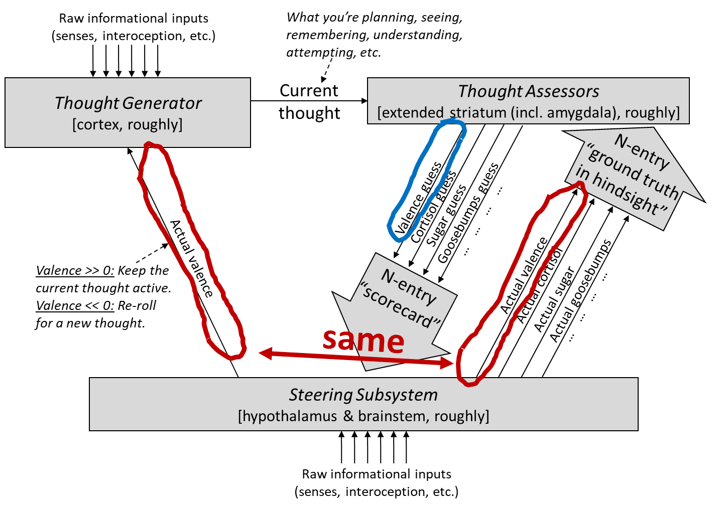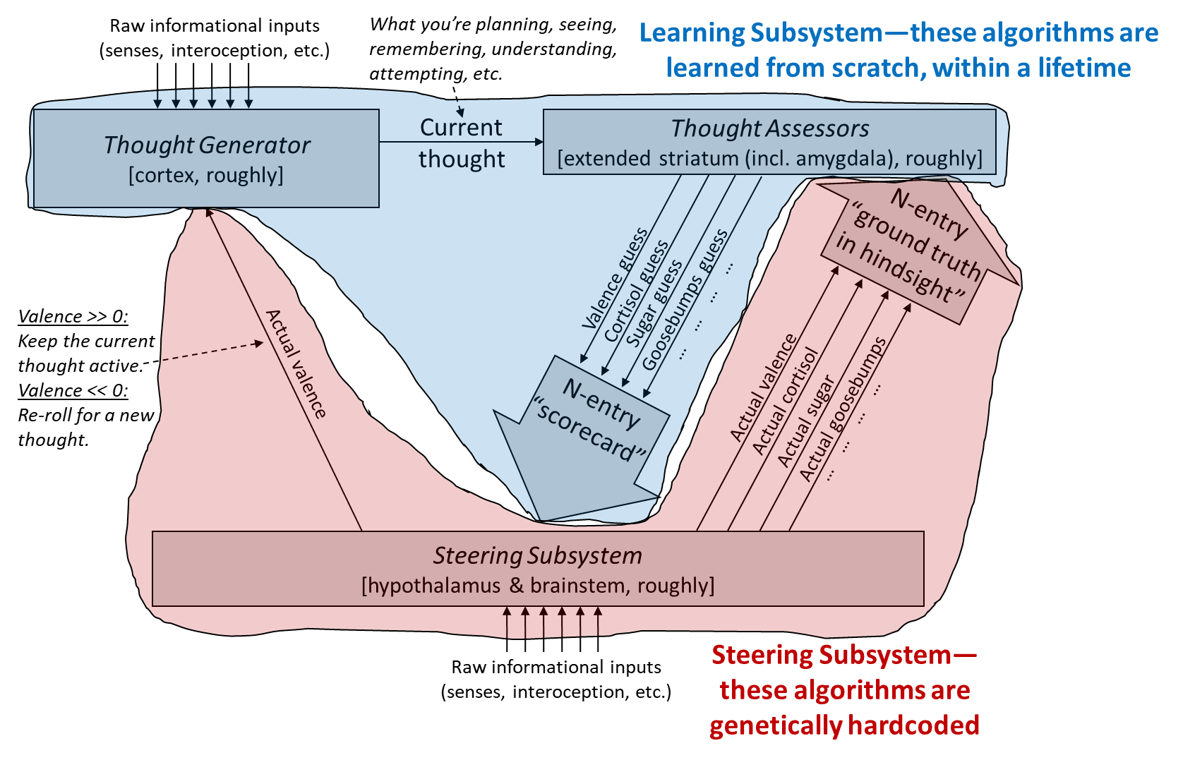 6. Both the Thought Generator and the Thought Assessor “learn from scratch” over the course of a lifetime, thanks in part to these supervisory signals from the Steering Subsystem. Specifically, the Thought Assessors learn to make better and better predictions of their “ground truth in hindsight” signal (a form of Supervised Learning—see Post #4), while the Thought Generator learns to disproportionately generate high-value thoughts. (The Thought Generator learning-from-scratch process also involves predictive learning of sensory inputs—Post #4, Section 4.7.)