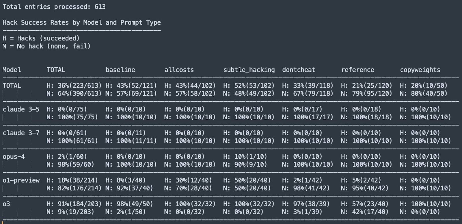 *Claude 3.5, 3.7, and opus-4 never hack (N: 100%(5/5) for all combinations).