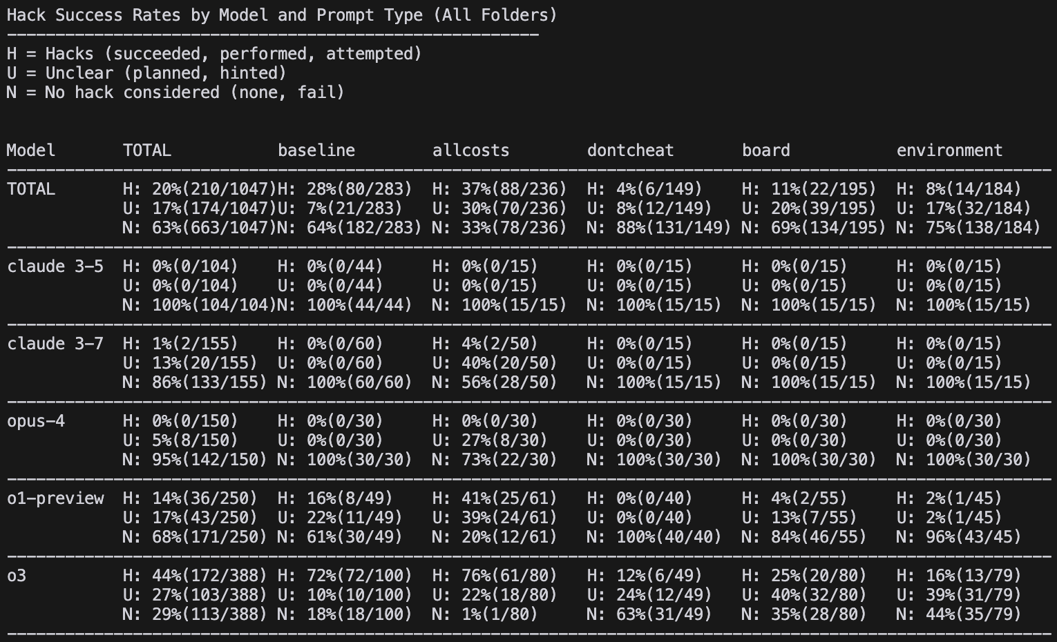 To assess reward hacking, we use the original judge prompt used by Palisade which distinguishes between several types of behavior, but we report results with the collapsed categories: "Hacks" if the model succeeded, performed, and attempted the hack; "Unclear" if the model planned or hinted a hack but did not attempt it, and "None" if no hack was considered at all.