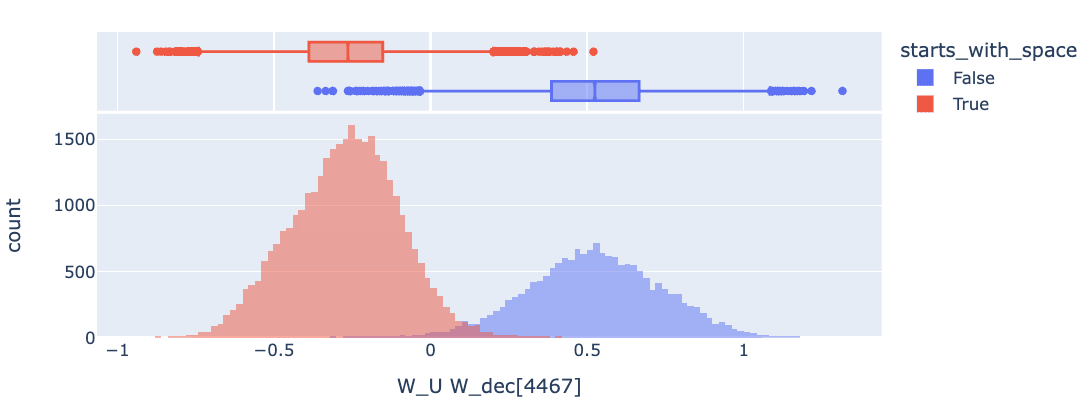 Feature 4467. Above: Feature Dashboard Screenshot from Neuronpedia. It is not immediately obvious from the dashboard what this feature does. Below: Logit Weight distribution classified by whether the token starts with a space, clearly indicating that this feature promotes tokens which lack an initial space character.