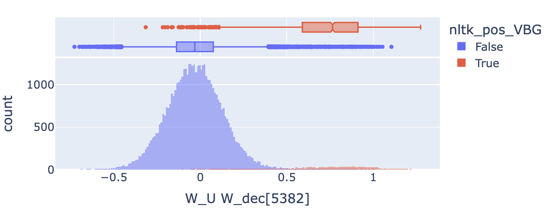 Feature 5382: This feature appears to promote verbs ending in “ing”. The overlap between the distributions appears a result of mislabelling by the NLTK part of speech tagger than any “misclassification” of the feature.