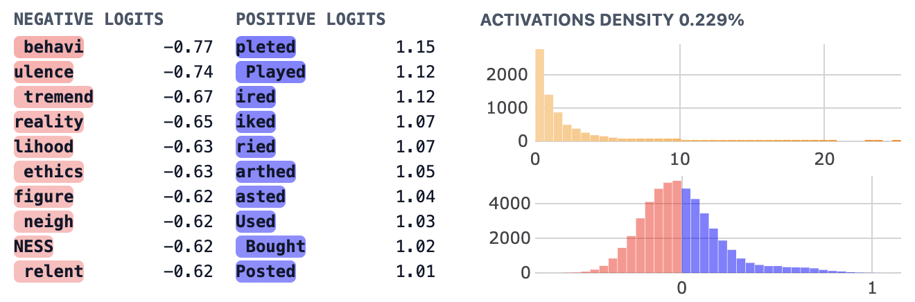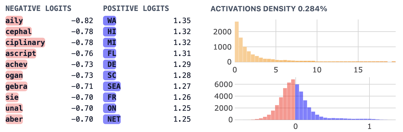 SAEs might enable us to decompose model internals into interpretable components. Currently, we don’t have a good way to measure interpretability at scale, but we can generate feature dashboards which show things like how often the feature fires, its direct effect on tokens being sampled (the logit weight distribution) and when it fires (see examples of feature dashboards below). Interpreting the logit weight distribution in feature dashboards for multi-layer models is implicitly using Logit Lens, a very popular technique in mechanistic interpretability. Applying the logit lens to features means that we compute the product of a feature direction and the unembed (WuWdec[feature]), referred to as the “logit weight distribution”.