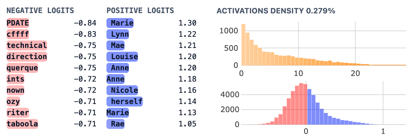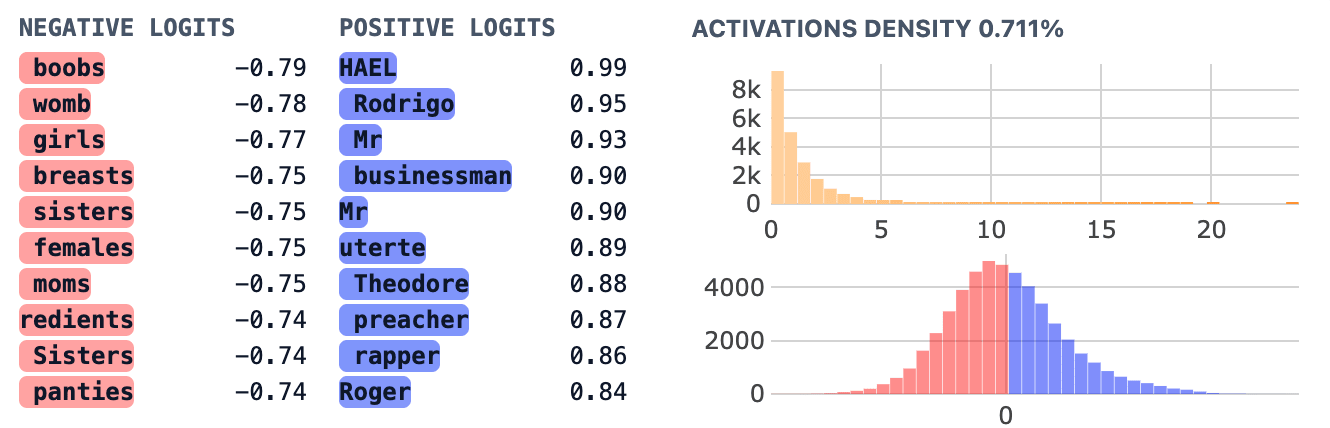Surprisingly, the top 10 negative logits are very female-oriented. To be clear, it is generally rare for both positive and negative logits to be interpretable, and this is one plausible exception. Moreover, since this feature lacks negative skewness, we wouldn’t have picked up on this as a “suppression feature” though it may genuinely be that it suppresses terms related to women.