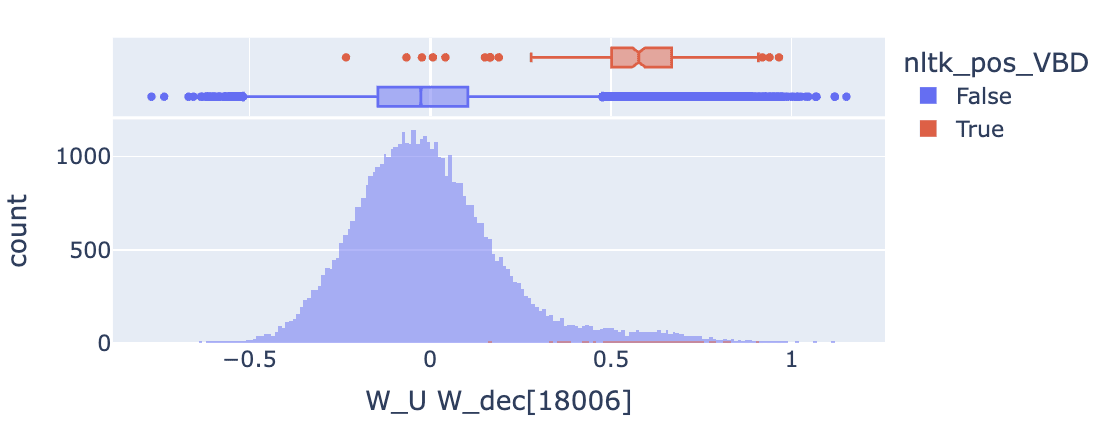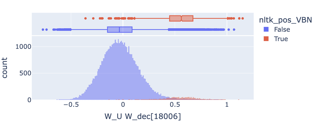Moving on, feature 18006 appears to promote tokens labeled as past participles (nltk_pos_VBN) as well as past verbs (nltk_pos_VBD). This is actually somewhat expected once you realize that all of these tokens are verbs in the past tense (and that you can’t really distinguish the two out of context). Thus we see that our set enrichment results can be misleading if we aren’t keeping track of the relationship between our sets. To be clear, it is possible that a feature could promote one set and not the other, but to detect this we would need to track tokens which aren’t in the overlap (eg: “began” vs “ begun” or “saw” vs “seen”. I don’t pursue this further here but consider it a cautionary tale and evidence we should be careful about how we generate these token lists in the future.