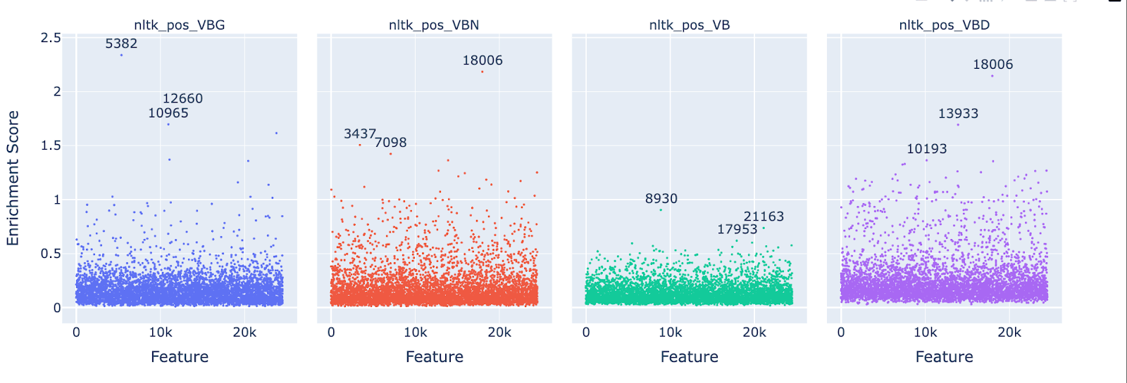 As before, we see a token set effect, though after seeing this result I feel more confident that set size doesn’t explain the set effect. Why do we not see features for base form verbs achieve higher enrichment scores than other (even smaller) verb sets? Possibly this is an artifact of tokenization in some way, though it's hard to say for sure. As before, let’s look at some examples to gain intuition.