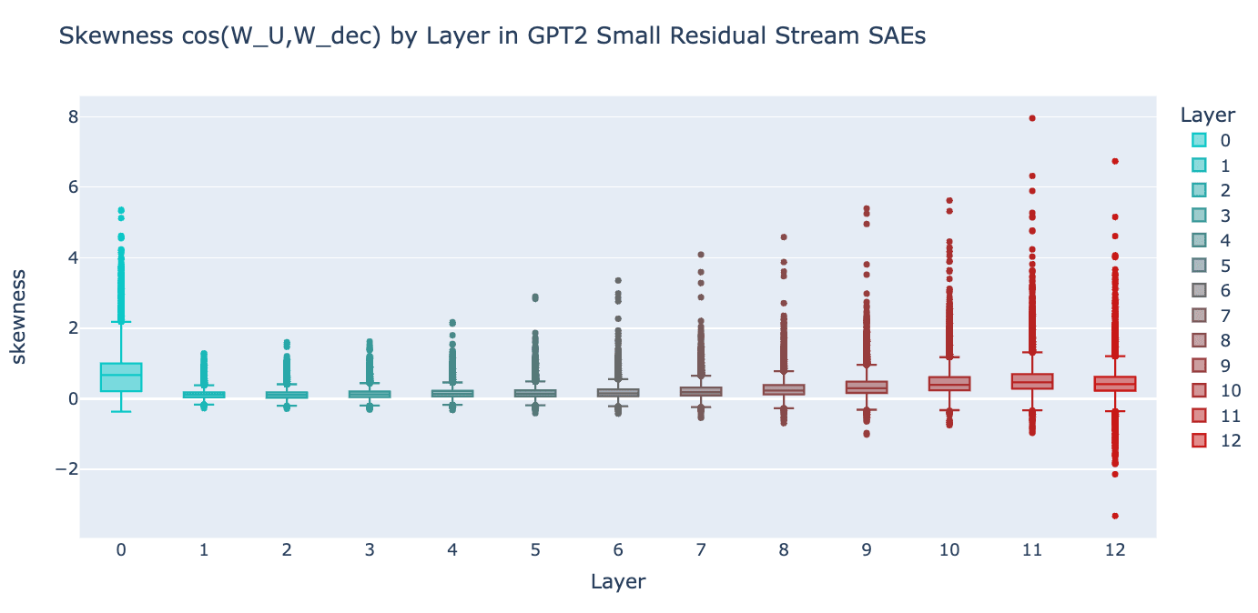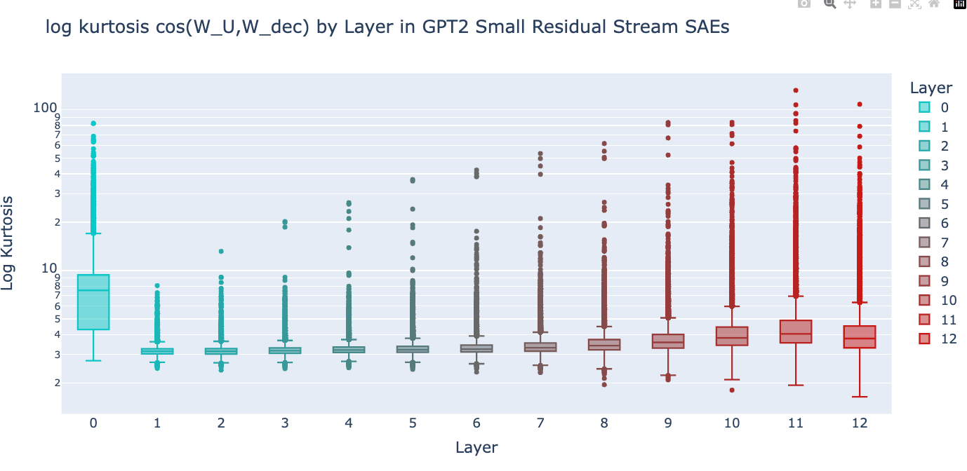 We note that statistics of the logit weight distribution of neurons have been previously studied in Universal Neurons in GPT2 Language models (Gurnee et al) where universal neurons (neurons firing on similar examples across different models) appeared likely to have elevated WU kurtosis. Neurons with high kurtosis and positive skew were referred to as “prediction neurons” whilst neurons with high kurtosis and negative skew were described as suppression neurons. Furthermore, partition neurons, which promoted a sizable proportion of tokens while suppressing the remaining tokens, were identifiable via high variance in logit weight distribution.