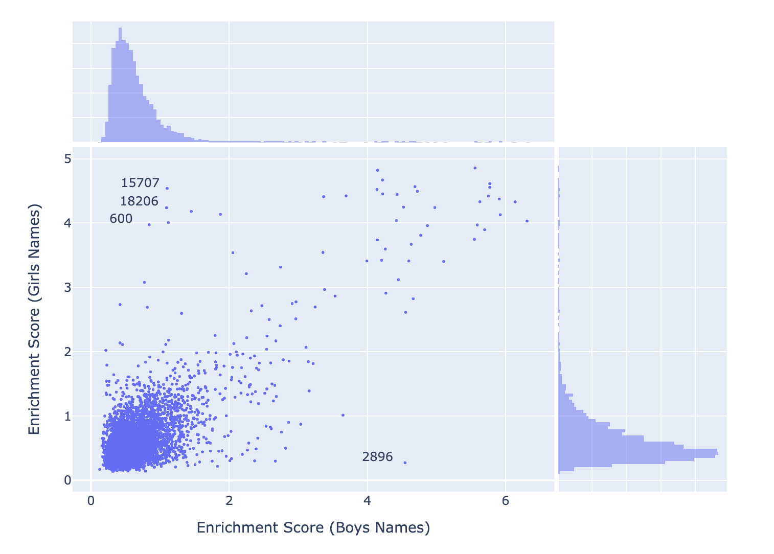 Scatter Plot of Token Set Enrichment Scores on the set of 300 most common boys names vs girls names for the top 5000 features by skewness. We’ve labeled points that are particularly far away from the y=x line. The marginal distributions of each feature are also shown to make the density easier to observe.