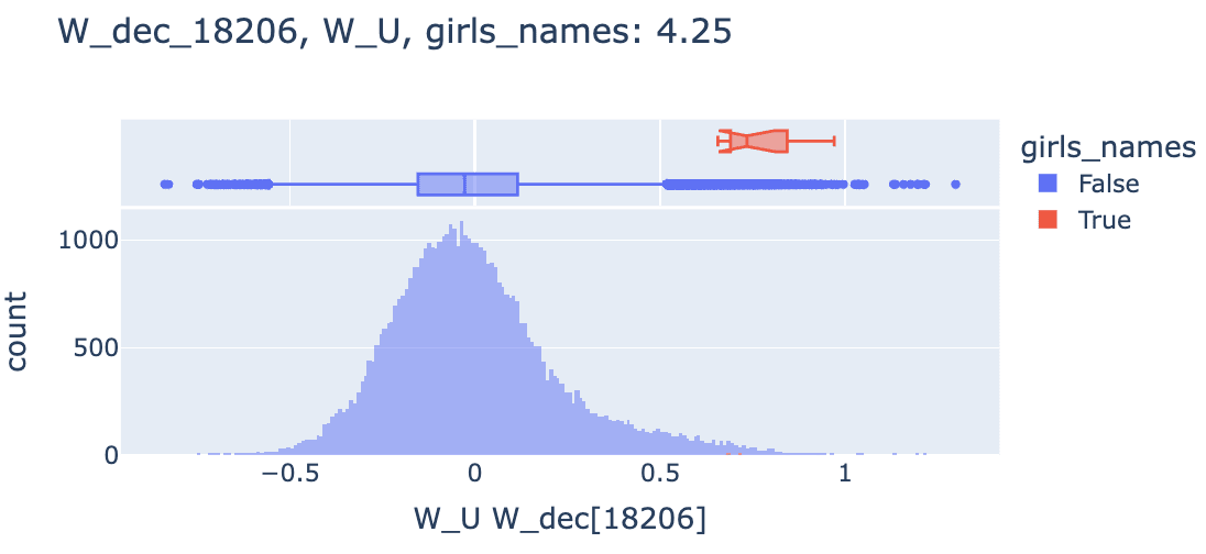 I think both of these cases studies suggested we had found interesting features that were non-trivially related to boys/names and girls names, but clearly enrichment results can’t be taken at face value due to factors like overlapping sets and the fact we’re apply the logit lens in model with a tied embedding.