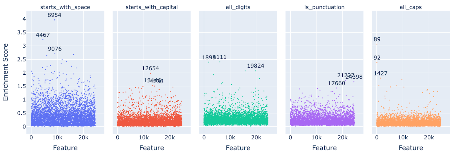 Regex Sets: Sets categorized by regex expressions (eg: starting with a specific letter, or capital, or all digits). Our interpretation of partition features (which distinguish tokens starting with a space or capital letter) can be verified in this way - see the plots at the beginning of the post.